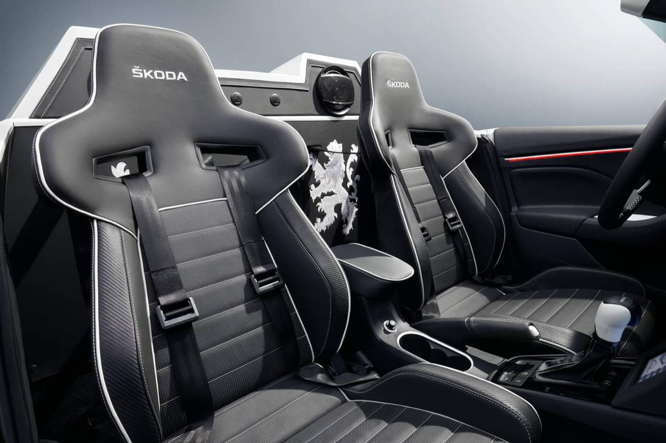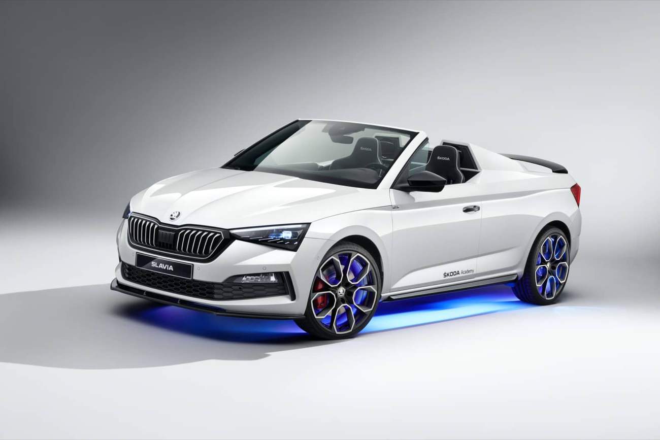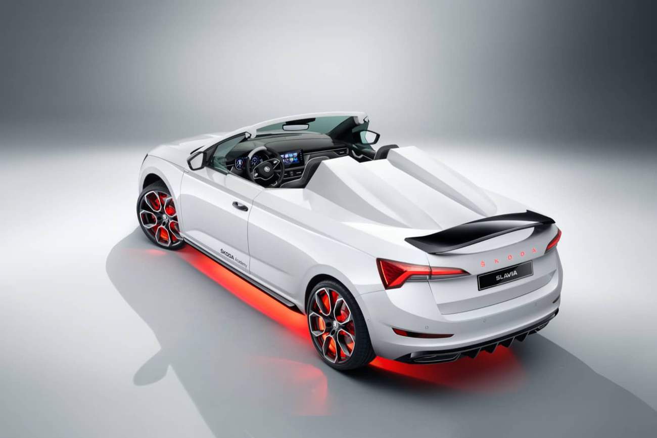 Letošní výtvor se jmenuje Slavia podle jízdních kol, která v samých začátcích historie značky vyráběli pánové Laurin a Klement. Původní Scalu rozhodně nezapře zpředu, kde se fakt prakticky nic nezměnilo, ale hned za A sloupkem se situace dramaticky mění. Přední sklo je více skloněné, přední dveře nemají rám a zadní tu nejsou vůbec. A taky chybí střecha. Která ve voze vůbec není, není ani nasazovací. Ale to u showcaru asi moc nevadí, v doprovodném voze bude jistě pro případy deště připravený partystan.