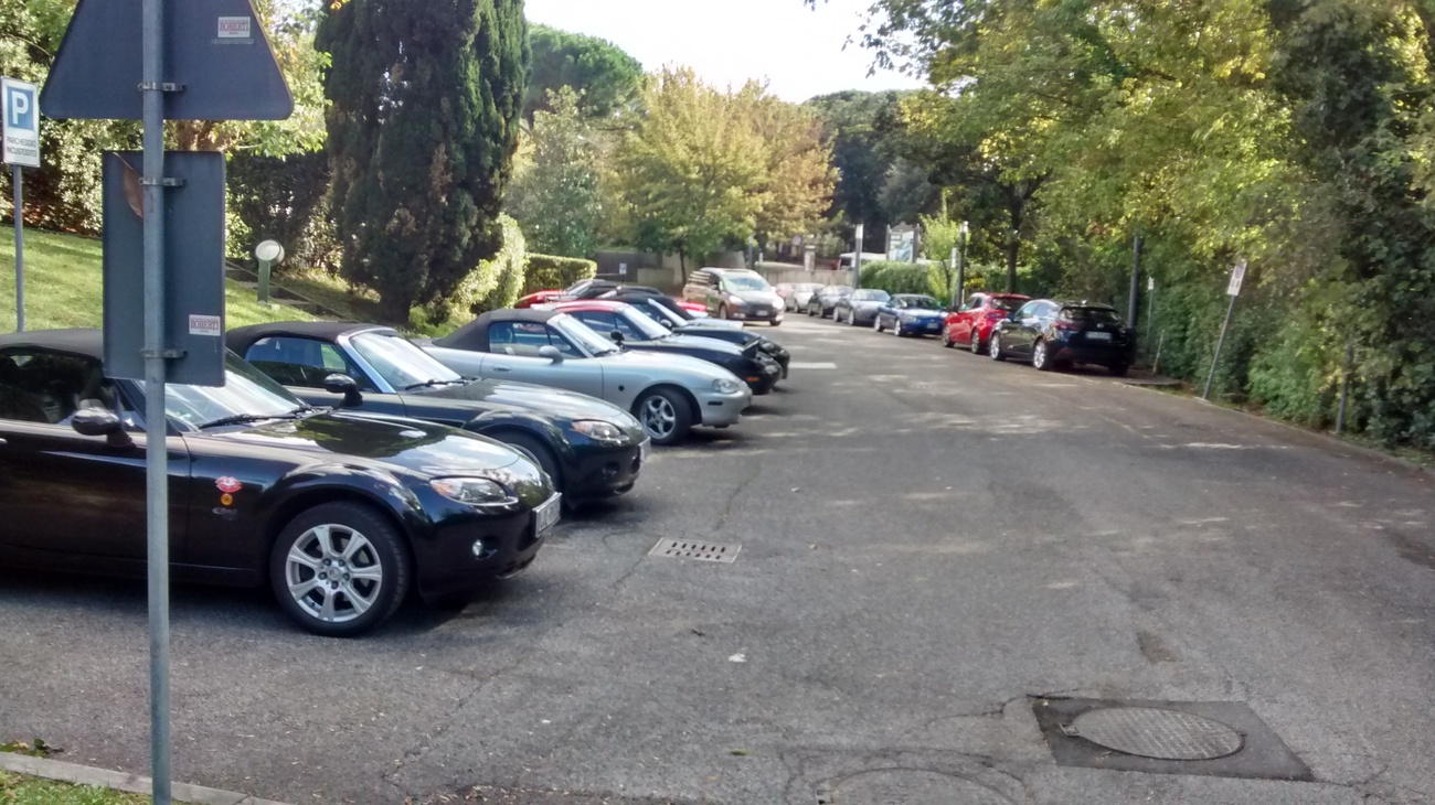 Přichází neděle a s ní začátek cesty domů. Ale ještě ne tak docela. Na odpoledne máme naplánovanou prohlídku Miatalandu. Jde o projekt jednoho zapáleného itala, který má rád auta a MX-5 obzvlášť a rozhodl se, že si ke své sbírce aut postaví i penzion a garáž specializovanou na Miaty. Po cestě jsme ale ještě navštívili město Todi, které je jako většina starých italských měst na kopci velice malebné. A vlastně taky trochu nuda. Když už jsme se podle GPS blížili k Miatalandu, tak jsme na odbočce, která byla do kopce, vyštěrkovaná a s rýnou z jedné strany, potkali našeho maďarského kolegu v NB. GPS nám tvrdila, že jsme správně, ale jak se ukázalo, byli jsme o odbočku vedle. Tahle vedla k hřbitovu. A když se Tamás pokoušel vycouvat, tak trochu zapadl jedním kolem do strouhy. Hups. Přiznám se, že mi to udělalo tak trochu radost. Znamenalo to, že i přesto, že jsme po cestě moc nestíhali, tak ještě nejsme tak strašně v háji jak on. Co se zapadlou Miatou? To, že se po cestě prosmýknu nad něj, to by ještě šlo, ale tomu, že bych ho vytáhl, tomu jsem moc šancí nedával. Pokusili jsme se tedy najít dovolat Andreovi, majiteli Miatalandu, ten nás odnavigoval k sobě a posléze nebohého maďara vytáhl za pomoci většího auta. A pak jsme měli komentovanou prohlídku. Jak si asi dokážete představit, Andrea má aut vážně dost. V jeho hangáru se kromě nějakého NC, které jezdilo mezinárodní MX-5 Cup, má plnou klec a normální značky a několika NB různých edic (třeba takové divné, červené s nápisy Mazdaspeed), vyskytovaly asi všechny edice NA, jaké existují. Od různých kitů, přes BBR Turbo a kousky od Mazdaspeed až po Monster Miatu. Naštěstí byla Potvora mimo doslech, tak jsem si mohl maličko zaslintat nad kouskem od BBR a několika dalšími. Kromě nepřiměřeného množství MX-5 má ale i další auta. Třeba Audi S8, jakou znáte z filmu Ronin. Nebo Renault Avantime. Prostě a jednoduše, je to vážně nadšenec. Pověděl nám i o svých záměrech s Miatalandem a o tom, že když se u něj ubytujete, tak vám na projíždku po okolí půjčí auto z jeho sbírky. Teda, pokud uvidí, že jste taky nadšenec. Pro běžné lidi bude mít vypůjčené ND od Mazdy. Už jsem začal plánovat, kdy se tam pojedeme podívat. Vážně mě to BBR Turbo zajímá. Skoro se nám ani nechtělo pryč, ale nebyl čas ztrácet čas. Loučíme se zejména s polskými kolegy v červené NA a jedeme pryč. Dál na naší cestě byla Parma. Cesta tam by byla víceméně nudná, kdybychom si nenašli ubytování na AirBnB a nenabrali na cestě zpoždění. Naše italská hostitelka bohužel nejspíš neuměla používat telefon a tak jsme s ní prochatovali necelou hodinku na wifi na pumpě, abychom si domluvili jiný čas předání klíčů. Inu, italové.
