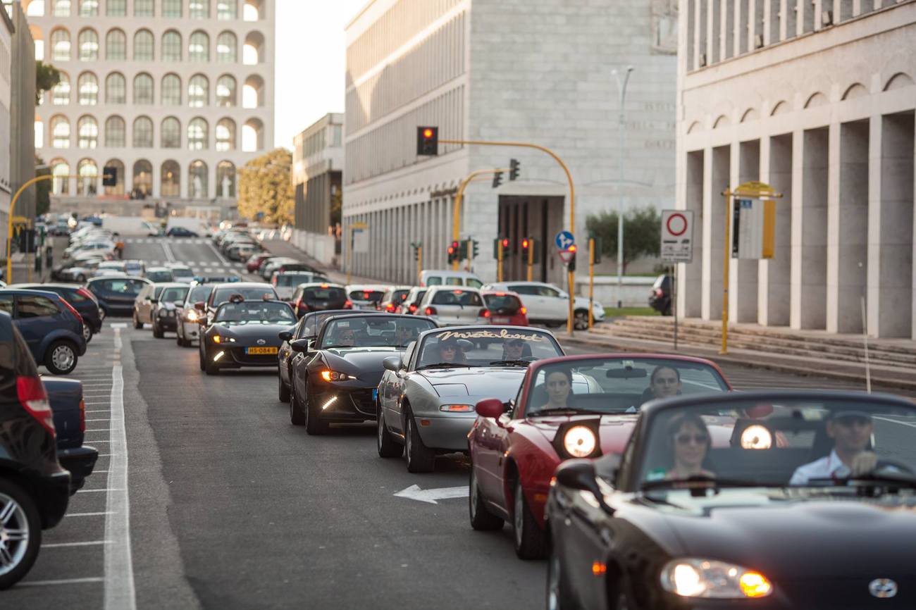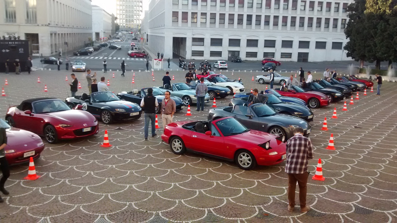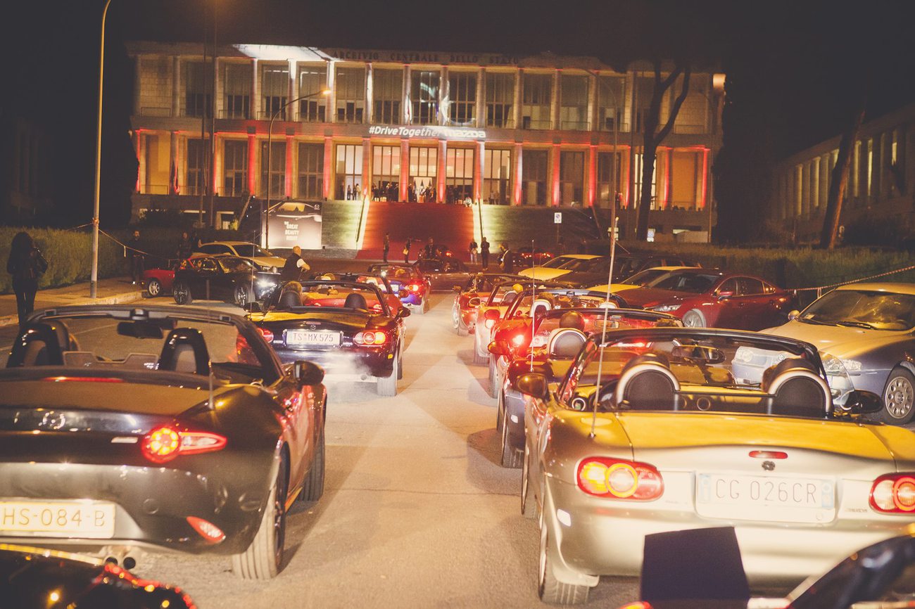 Po kině jsme se v další koloně, tentokrát bez policie, odebrali pár set metrů daleko do státního archivu na večírek s překvapením. A tím překvapením nebyl dobře zásobený bar (ten je přece samozřejmostí), ale možnost podívat se, osahat si a osedět si MX-5 RF. Nechyběla plachta a tancující lidé. Prostě odhalení jak má být. Pokud náhodou nevíte, co to je, tak je to ND s pevnou střechou, ze kterého se stala tak targa. Než jsem si do toho sedl, tak jsem byl skeptický. Kdo by chtěl targu, když může mít kabrio? Ale pak jsem si sedl dovnitř a zjistil, že je to vážně docela dobře udělané. A možná jsem i uznal, že ten nápad bude něco podobného jako NC s hardtopem. Dost bylo o RF, máme tu večírek! Ten má ale jednu zásadní chybu. Venku mi stojí auto a hotel je na druhé straně Říma. Ach jo, tak žádné velké pití a navazování nových přátelství v duchu alkoholového opojení nebude. Dejte mi pivo a něco k jídlu. Čekal jsem, že ostatní nebudou takoví páprdové a okolo se rozjede bujarý večírek, ale opak byl pravdou. Lidé pomalu ubývali a okolo jedné ráno jsme to zabalili i my.