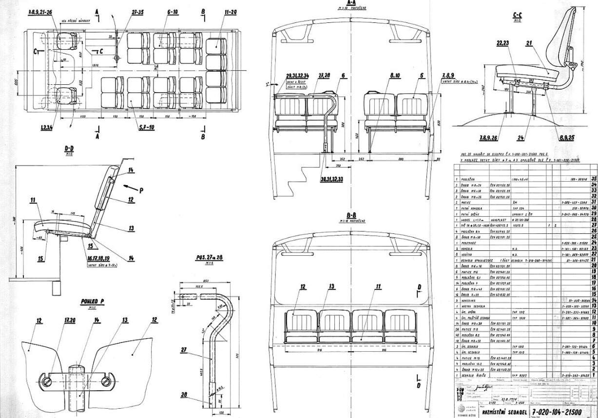 Záhy došlo ke zjištění, že uskákaný podvozek příliš nevyhovuje přepravě osob ve stoje a tak byl přepracován zasedací pořádek. nakonec se tak do vozu usadilo devatenáct pasažérů a řidič. Interiér byl vybaven typickými černými pěnovými sedačkami, jež možná pamatujete z městských “sedmičkových” Karos. Právě rozkres nového zasedacího pořádku je druhým z celkem tří dokumentů, které se dají o vozu v archivech dohledat.