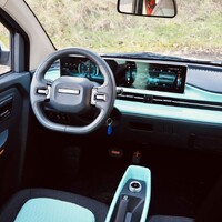 Ještě větší překvapení nás čekalo uvnitř. Kabina je minimalistická, což je logické – stále se bavíme o miniaturním automobilu a s prostorem je třeba hospodařit rozumně. Ale zároveň je interiér Ponyho vážně hezký. Kabinu prosvětlují tyrkysové ozdobné prvky s karbonovou strukturou vtipně se doplňující s oranžovými detaily a hi-tech dojem dodává dvojice displejů, které si svým rozlišením nezadají ani s vozy prémiových značek. A je tu výbava! Automatická klimatizace, radiomapa postavená na systému Android nebo třeba parkovací kamery. Ne jedna, ale hned čtyři, skládající dohromady 360° obraz, a to ve skvělém rozlišení.