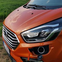 Oranžová osobní dodávka od Fordu nevypadá na první pohled jako automobil, který by snad měl jitřit emoce, nebo si zasloužit přivlasky jako “revoluční”, nebo “odvážný”. Jenže právě tady platí, že nemá smysl soudit knihu podle obalu. Tím obalem je dobře známý Transit čtvrté generace po faceliftu, v tomhle případě nalakovaný do veselé oranžové metalízy s pár vzhledovými vychytávkami. Design současné generace je poměrně odvážný, na autě se nachází celá řada prolisů a výdutí, z boku zaujmou vytažené blatníky stoupající linie oken, vepředu si pak všechnu pozornost uzurpují LED světla s pěkně provedenou obroučkou denního svícení.