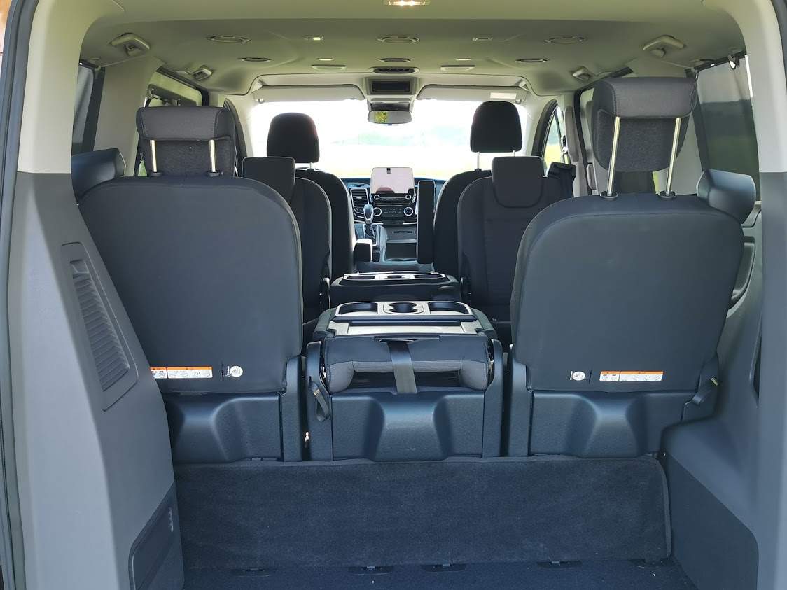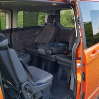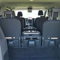 Testované auto je nakonfigurováno jako rodinný dostavník, případně velkokapacitní taxi. Na palubě je k dispozici osm sedadel ve třech řadách, obě zadní řady lze po jednom sedadle z vozu vyndat, případně otočit prostřední cestující proti směru jízdy. Trochu zamrzí, že sedadla nelze libovolně posouvat, ale vždy pouze ukotvit do předem připravených ok v podlaze, čímž trochu trpí variabilita prostoru. Druhou vadou na kráse je pak modul topení a klimatizace, který v zadní části vozu vyrůstá z levého boku a znemožňuje umístění zadní řady sedadel k víku zavazadlového prostoru.