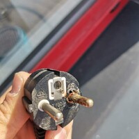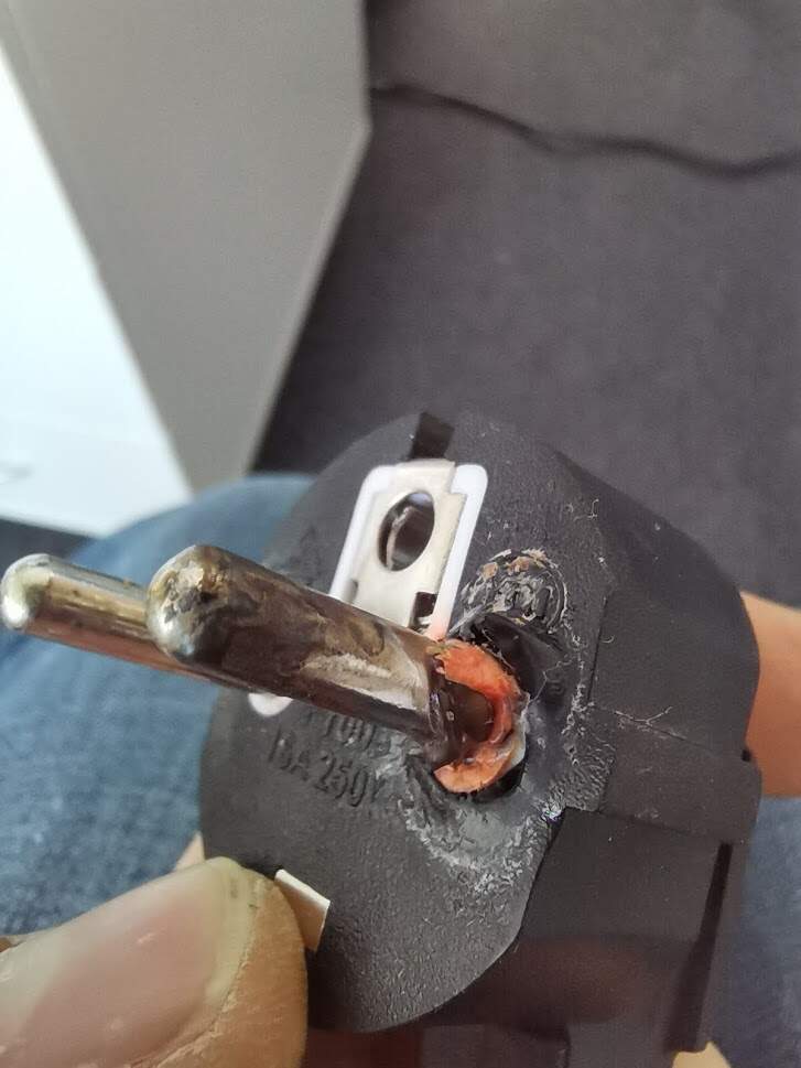 Leč obrázek výše vám již napověděl, k čemu došlo. Z idylického rozjímání mě vyrušil kolega, který mi se stojickým klidem oznamoval, že “z té elektriky u auta se nějak kouří”. A měl pravdu – propojení nabíječky a prodlužováku skutečně emitovalo šedivý dým doplněný pachem spálené gumy a plastu. Rychle jsem vůz odpojil od sítě a po troše zápolení jsem od sebe oddělil spečené komponenty zásuvky a zástrčky.
