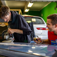 Když specialisté z Italmotori vyměnili provozní kapaliny a vrátili brzdám nebohého staříka opět mladickou schopnost zastavit vůz na dráze přijatelné délky, je nám vůz k dispozici. Nastupuje práce méně odborná a tedy vhodná pro tým Autíčkáře. Hadříkem odkrývám původní odstíny interiéru, zatímco kolega Jakub leštičkou oživuje pastelově modrý lak. Neskromně k tomu dodávám, že obojí dopadlo lépe, než jsem očekával.
