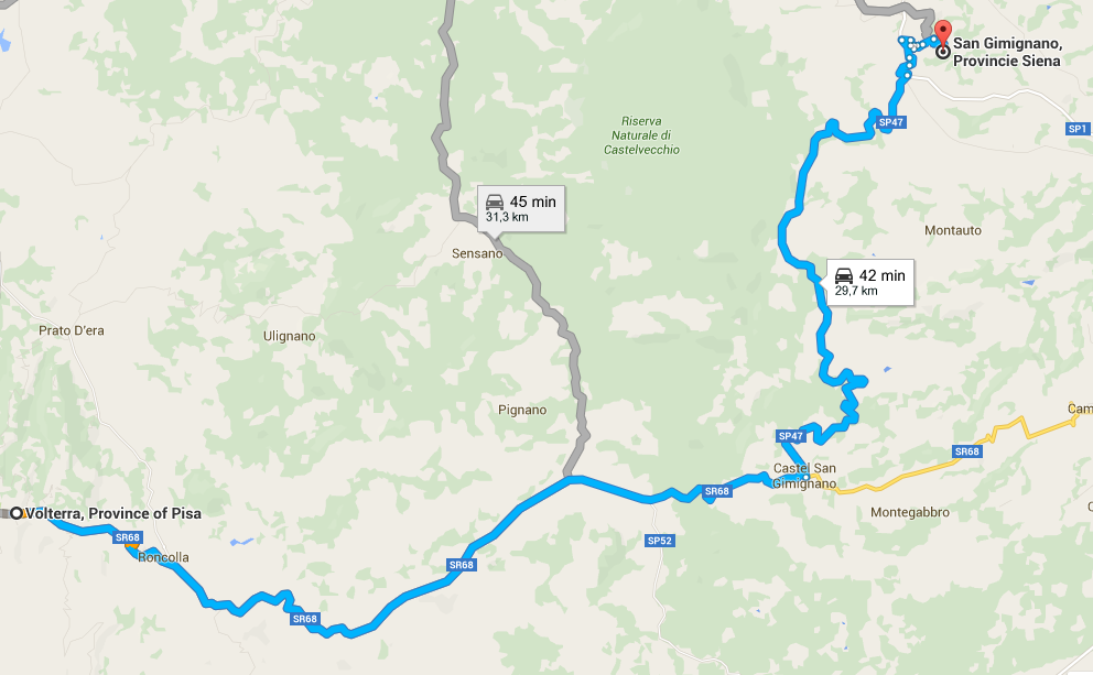 I já jsem na jednom z výletů našel svůj nový řidičský ráj. A hned jsem téměř zapomněl na nádherné hladké okresky vinoucí se francouzskou oblastí Provence, které jsem poznával za volantem Alfy z půjčovny. Věc se má takto: pojedete-li někdy do Toskánska, navštívíte starobylé město Volterra (a věřte mi, za návštěvu opravdu stojí) a budete se chtít podívat i do prastarého opevněného města s názvem San Gimigniano (tohle stojí za návštěvu ještě o něco víc), musíte se dát cestou s číslem SR68. Nebo nemusíte, jak je vidět z obrázku, ale prostě chcete. Celá cesta sestává v podstatě ze tří úseků. Hned za Volterrou se octnete na kopci pokrytém poli s okreskou vinoucí se jako had nejrůznějšími druhy zatáček, s horizonty, technickými sjezdy i pomalými výjezdy na kopce. Místy je povrch méně kvalitní, ale snad i tato skutečnost dodává silnici na náročnosti a techničnosti. Následuje rychlejší část po široké silnici, která, ač stejného čísla, vypadá jako silnice jiné kategorie, abyste vzápětí sjeli na točitou SP47 s dokonalým povrchem a ještě obtížnějším, ale zato obrovsky zábavným profilem. Právě ono spojení náročné, technické silnice s nádhernými rozhledy do krajiny dělá z tohoto výletu něco unikátního. Pravda je ovšem taková, že svou oblíbenou silnici si zde najde každý. Ne nadarmo se spousta novinářských prezentací automobilů odehrává právě v Toskánsku. Oproti již zmíněné Provence je zde nutno věnovat více pozornosti kvalitě povrchu, krajinný ráz a atmosféra toskánského venkova mě však přinutila přehodnotit volbu mé nejoblíbenější silnice.