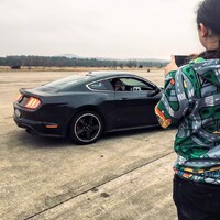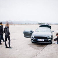 Jsme tu ale hlavně kvůli jízdním fotkám. Celá výprava se proto záhy přesouvá na letištní plochu. Tam nejprve probíhá nezbytné “seznámení se s prostorem” za volantem Mustangu (kdyby to nebylo zakázané, určitě bychom tu vyzkoušeli maximálku a zjistili, že to je 269 tachometrových). Když se všichni dostatečně vyblbnou, přijde čas na hadříky z mikrovlákna a vodu se šamponem. Po chvíli se Mustang znovu blýská a je na čase připravit na jízdní fotky i fotografa.