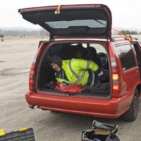 Ve skutečnosti po chvilce laborování přivážeme Radka navlečeného do neforemné reflexní bundy tažným lanem ke sklopené zadní sedačce v mém starém Volvu. Víko kufru následně přichytím kurtou ke střešním lyžinám a s jasnými instrukcemi (tyvole, Radku, hlavně kdyžtak nevypadni na ten Mustang, to by se mohl rozbít) se pomalu vydáváme na letištní plochu. Ano, výsledkem jejich snažení bylo, že místo odřenin a ostudy hrozilo muži z Gottwaldova roztržení vejpůl. – Jeniik