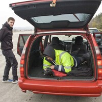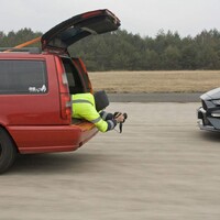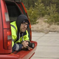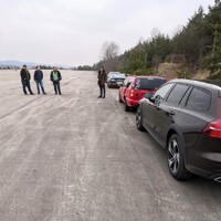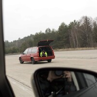 Focení probíhá hladce, Radek evidentně drží na místě a nemá tendenci vypadávat ven. Brzy se k nám přidávají i další členové redakce a záhy brázdí čtveřice aut plná vysmátých podívínů přistávací plochu tam a zpět. Všechno jde hladce. Teda alespoň do doby, než ve zpětném zrcátku zaregistruji jakési modré blikání. Vypadá to, že na té ceduli popsané drobným písmem, která stála u vjezdu na letiště, bylo asi napsáno cosi o tom, že bychom tu neměli být. Zlokočka se hrdinně obětuje pro tým a zůstává vzadu jako kořist pro Octavii s modrými majáčky. Po chvíli napětí za námi přijíždí. Žádné drama se naštěstí nekoná a na pokutu se skládat nebudeme. Prý jen nemáme jezdit tak rychle a nápadně. No dobrá, to bychom snad měli zvládnout. Fotíme několik posledních jízdních záběrů a statické fotky. Slunce se pomalu sklání k západu a začíná se šeřit. Je na čase jet domů…