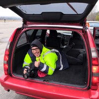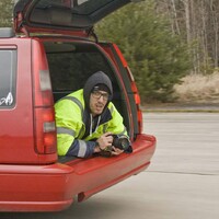 Radek si vmžiku oblékne speciální celotělový postroj a nastoupí v neoprénovém ochranném obleku do speciálně upraveného Range Roveru se stojanem na foťák. A nebo vlastně jakoby spíš…