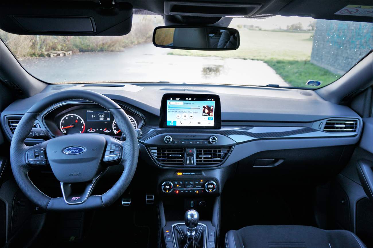 Interiéry hothatchů těží z výhod i nevýhod obyčejných kompaktů, ze kterých původně vycházejí. Výhody jsou nasnadě. Velmi dobrá ergonomie a dostačující prostornost na každodenní potřeby. Dozadu bez potíží nacpete dítko i s autosedačkou a do kufru týdenní nákup. O kvalitní ozvučení se v případě ST postarala firma Bang & Olufsen, takže ani tady není prostor pro výraznější kritiku. Skvělé jsou sedačky Recaro, které dodávají podporu i mému neforemnému tělu a nalezení perfektní pozice za volantem je otázka chvíle i díky tomu, že si lze shodit sedačku ”až zem”. Člověk tak získá lepší pocit sepjetí se svým vozem. Pochválit musím i tak obyčejnou věc, jakou je volant, protože má naprosto ideální tloušťku i velikost a je i vcelku kulatý (zarovnání se nevyhnula jen spodní část). Jeden by řekl, že je to snad samozřejmost, ale věřte mi, není. Nevýhody však vidíte na první pohled. Tohle není prémiový (ať už se pod tím slovíčkem skrývá cokoli) vnitřek. Chybí mu zajímavější ztvárnění, něco co by vás uspokojilo pokaždé, když si uvědomíte, kolik jste za takové auto dali peněz. A takový hothatch, to není zrovna levná sranda. Co obstojí v základním modelu za čtyři sta, působí v autě za osm set trochu nepatřičně. Nu což, to je daň za hothatch. Nutno podotknout, že tohle je však problém všech rychlých hatchbacků a Focus mezi některými konkurenty působí ještě vlastně docela dobře.