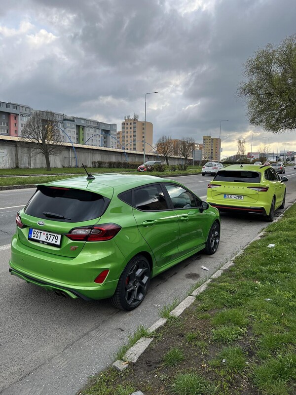 První věc, která mě moc potěšila, je barva. Očekávatelně. Nemám teď na mysli pouze fakt, že je to skoro stejně krásně „zlá zelená” (mean green) jako na mém Triumphu. Především se jedná o veselý, rychlý, sportovní, někdo by snad řekl i bláznivý automobil a konečně dostal nadělenou i barvu stejných přídomků. Ani vínové ST pana Křečka mě neuráželo, prostě konečně nějaké veselejší barvy a ne jen šedá základovka za příplatek. Další věcí, která se mi moc libíla, jsou ochranné lišty na dveřích, abyste si neomlátili jejich hranu. A také auto stojící vedle vás. Pozoruji, že s tím druhým mají někteří, řekněme méně automobilně nadšení řidiči, dost problém. Pardon, trochu jsem odbočil, hejt podobného typu si schovám do jiného článku. Lišty však nejsou na svých místech zacvaknuty nastálo jako odrazky za dob stodvacítek, ale díky jednoduchému systému elegantně vyjedou až po otevření dveří a opět samy zmizí s jejich zavřením. Speciální adresovanou zmínku si ještě rozhodně zaslouží LED světla a jejich automatická funkce (vykreslování, pouštění/zhasnutí dálek). V automobilovém světě nic nového, tahle fordí však s přehledem reagují ve srovnání s prémiovými značkami nejpohotověji, navíc brutálněji. Při nočním výletu na okresky prostě vidíte maximum možného, a to bez oslňování ostatních účastníků provozu. Stačí prostě jet libovolnou rychlostí, a před vámi se rozsvěcuje okolí.