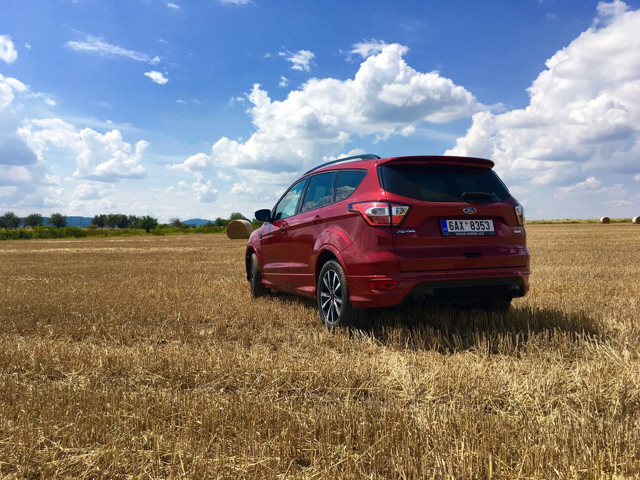 Za těchto myšlenek jsem dorazil do Fordu, kde už na mě čekala ,moje’ Kuga. První dojem? Měl jsem vždycky Kugu za takové generické SUV. Takové auto s povinně dynamickými linkami a divoce tvarovanými světly. Stojí přede mnou v rudé metalíze a úpravě ST-line a přestože tu skutečně jsou dynamické linky a divoká světla, design nepůsobí genericky. Je jasně rozpoznatelné, je to zkrátka Ford. Provedení ST-line ještě lehce přidává na agresivitě, ale vlastně proč ne? K typickému postoji auta od Fordu s kabinou posunutou vpřed a přídí výhružně přimáčknutou k zemi se to hodí. Celkově je design Kugy svěží a troufám si trvdit, že bude stárnout velmi pomalu.