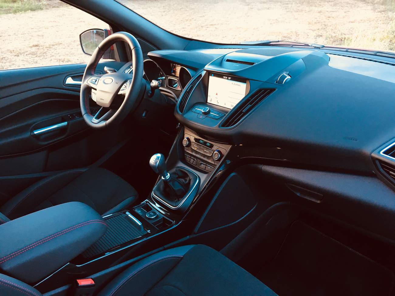 Uvnitř nabývá tvarová divočina úplně jiných rozměrů. Pro tradicionalisty to může být trochu problém, ale nenechte se odradit. Ono to všechno má nějaký smysl. Ovládací prvky jsou seřazeny v logických skupinách a rozmístěny tak, jak velí zdravý rozum. Snad jen dotyková obrazovka je trochu daleko a utopená, takže drobnější řidiči/řidičky se k ní budou muset natahovat. Naopak velmi důmyslným detailem jsou výdechy klimatizace umístěné pod celým modulem nesoucím radiomapu – směřují chladný vzduch směrem k posádce nenásilnou formou – žádné prsty přimrzlé k volantu a vlasy vlající v ledovém orkánu. Už druhý den testu jsem se v autě zabydlel, prvotní šok s divokých tvarů odezněl a dokonce jsem se přistihl při myšlence, že se mi tu vlastně líbí. Volant je skvělý. Je hezký, dobře padne do ruky a má příjemný průměr. Řadicí páka na vyvýšeném místě je zkrátka dobrý nápad a tak bych mohl pokračovat. Dokonce i samotná radiomapa se tu tváří poměrně schopně a použitelně. Ford získává za interiér palec nahoru.