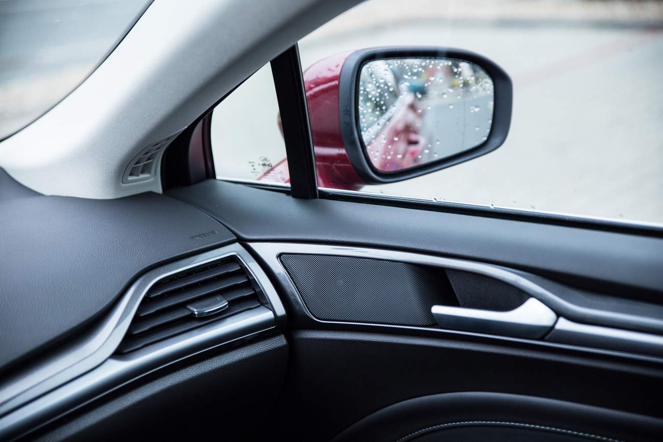 Uvnitř je to vlastně podobné, největší změnou jsou budíky, které v tomto případě postrádají otáčkoměr a tak přístrojovému štítu vévodí jeden velký tachometr, který z každé strany doplňuje jeden displej. Na tom levém si můžete zobrazit všechna důležitá jízdní data. Na pravém pak určitě rádi využijete zobrazení listů účinnosti, jak je zanvaná vizualizace, kde rostou či opadávají listy podle toho, jak úsporně jedete. Dalším ‚detailem‘ v interiéru, který mě zaujal je pomyslná jeskyně ve středovém panelu. Když už pomineme to, že jen znázorňuje, jak je celý středový panel a navazující tunel zbytečně široký, koho a proč napadlo umístit tak hluboko odkládací prostor? Vážně mě nijak nelákala představa toho, že tam cokoli odložím a pak budu muset zabořit svou ruku až po loket, abych to zase vyndal. Na druhou stranu, jinak proti interiéru nemám špatného slova. Sedačky jsou pohodlné, bez výrazného bočního vedení, ale kdo jej v Mondeu potřebuje, že? Svým způsobem mi přišel zábavný panel s ovládáním rádia, který jako by vypadl z hifi věže ze začátku milénia, který obklopuje ovládání klimatizace a ostatních záležitostí jako výhřev sedaček. Tak trochu jako připomínka starých časů působí i slícování dveří a palubní desky. Na fotce níže to není až tak moc zřetelné, ale na pohled a na dotyk je cítit, že tady něco nesedí.
