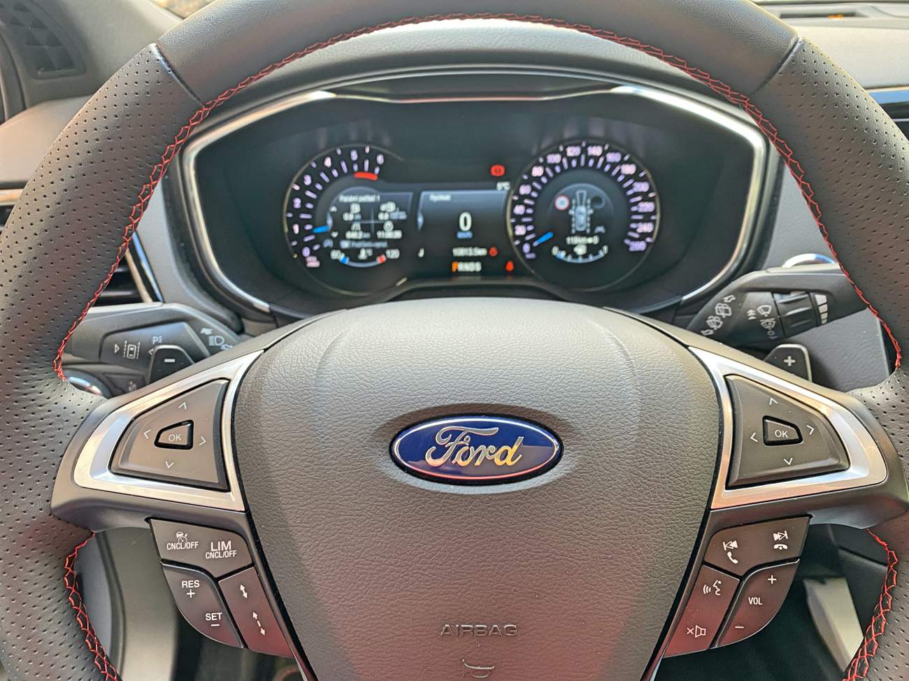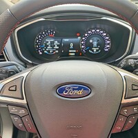 Odvrátil jsem zrak od guána a usedl za volant. Je dobře, že na něm je velké logo Ford, aby člověk nezapomínal, v jakém autě vlastně sedí, kromě loga je na volantu více než tucet tlačítek, jejichž pochopení mi dalo chvíli času, ale musím uznat, že na návod k použití dojít nemuselo. Infotainment fungoval výborně a spárování s telefonem bylo hotové v mžiku, jen to grafické zpracování ubírá autu nějakou tu dynamiku. Je to škoda, protože vnitřek vozu nijak nezaostává za exteriérem, tu je měkký, tu je lesklý, tu je kůže, tu je chrom, vše červenou nití lemované a do toho je na šedé hranaté dlaždici na obrazovce napsáno Iphone a na šedé dlaždici pod ní také Iphone. I přes dlaždice a barevné přechody je ovládání zcela intuitivní.