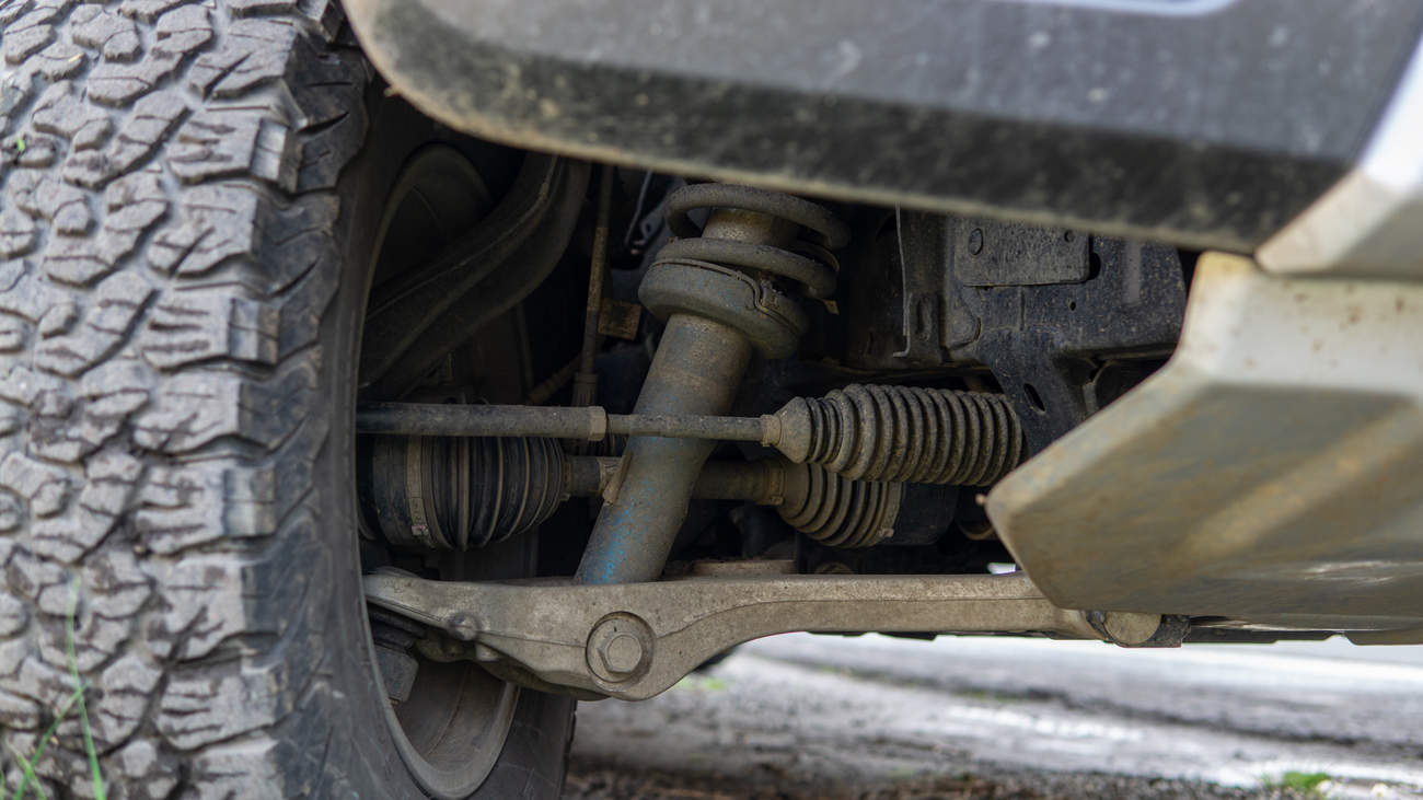 Tohle auto je prostě jen a jen o podvozku. Je offroadový, ano, ale jinak naladěný. Tam, kde se offroad zaměřený na prostupnost terénem a citlivý přístup, rozkýve a začne žehlit nerovnosti, tam Raptor drnčí. A tam, kde se běžný offroad začne houpat, skákat a přeskupovat lidi v interieru, tam Raptor drnčí. Tlumení je hodně tuhé, aby chytalo doskoky a velký muldy, rozchod je široký, aby byla stabilita a stabilizátory musí být tlusté jako stehna přezrálé ženy. Na běžné vozovce pak není Raptůrek z nejpohodlnějších. Pneumatiky 285/70/R17 se pod podvozkem tak nějak vrtí a člověk má pocit, že celá ta věc moc nefunguje. Jenže z mé zkušenosti plyne, že stejně "nefunguje" i v trojnásobné rychlosti na mnohem rozbitější cestě. A vrtění kabiny z velké části poberou křesílka a zasloužená vrstva tuku okolo řidiče. Zadní náprava navíc při zrychlování nadzvedává korbičku, to je milý detail. Detail zaměřený na rychlou jízdu příšerným terénem. Ne detail zaměřený na styl a pohodlí, nebo nedejbože ekológii.