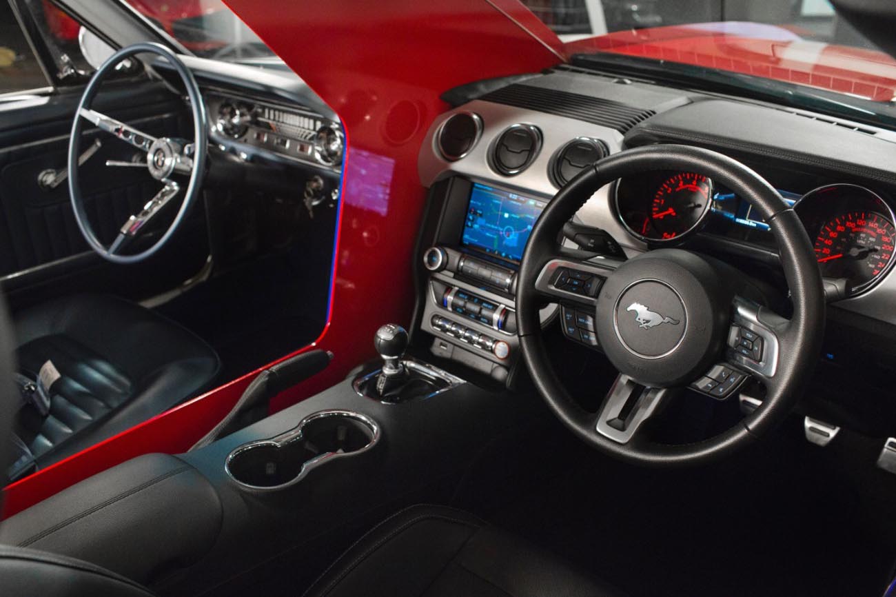 K sobě slepené dva Mustangy ukazují padesát let vývoje pony-car