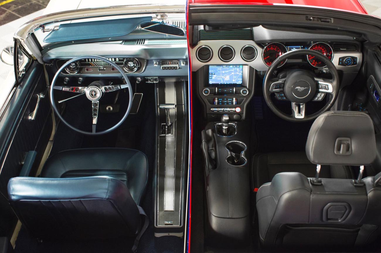 K sobě slepené dva Mustangy ukazují padesát let vývoje pony-car