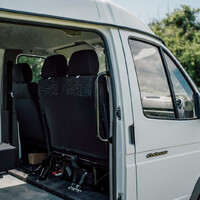 Vpředu se sedí pohodlně, jen prostřední sedadlo je, jak je pro dodávky typické, trochu stísněné. Prostor pro nohy zde navíc ubírají páky řazení čtyřkolky a redukce. Ve druhé řadě osobní verze je ve dva a čtvrt metru vysoké a dva metry široké karoserii prostoru nadbytek, cestující zde si dokonce mohou požádat řidiče o zapnutí přídavného větráku ventilace. Nebo otevřít nahoru vysouvané střešní okno, které současně plní účel nouzového východu. Zadní sedadla ale příliš pohodlná nejsou, což v konečném důsledku tolik nevadí, protože Sobol není auto na delší cesty.