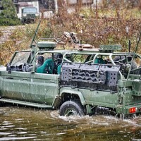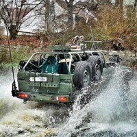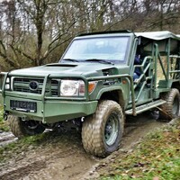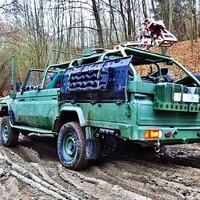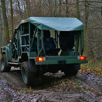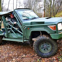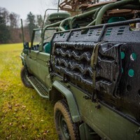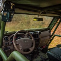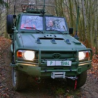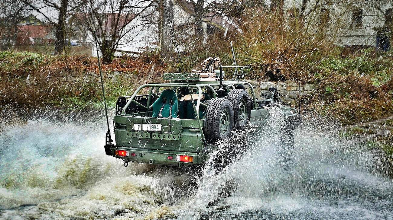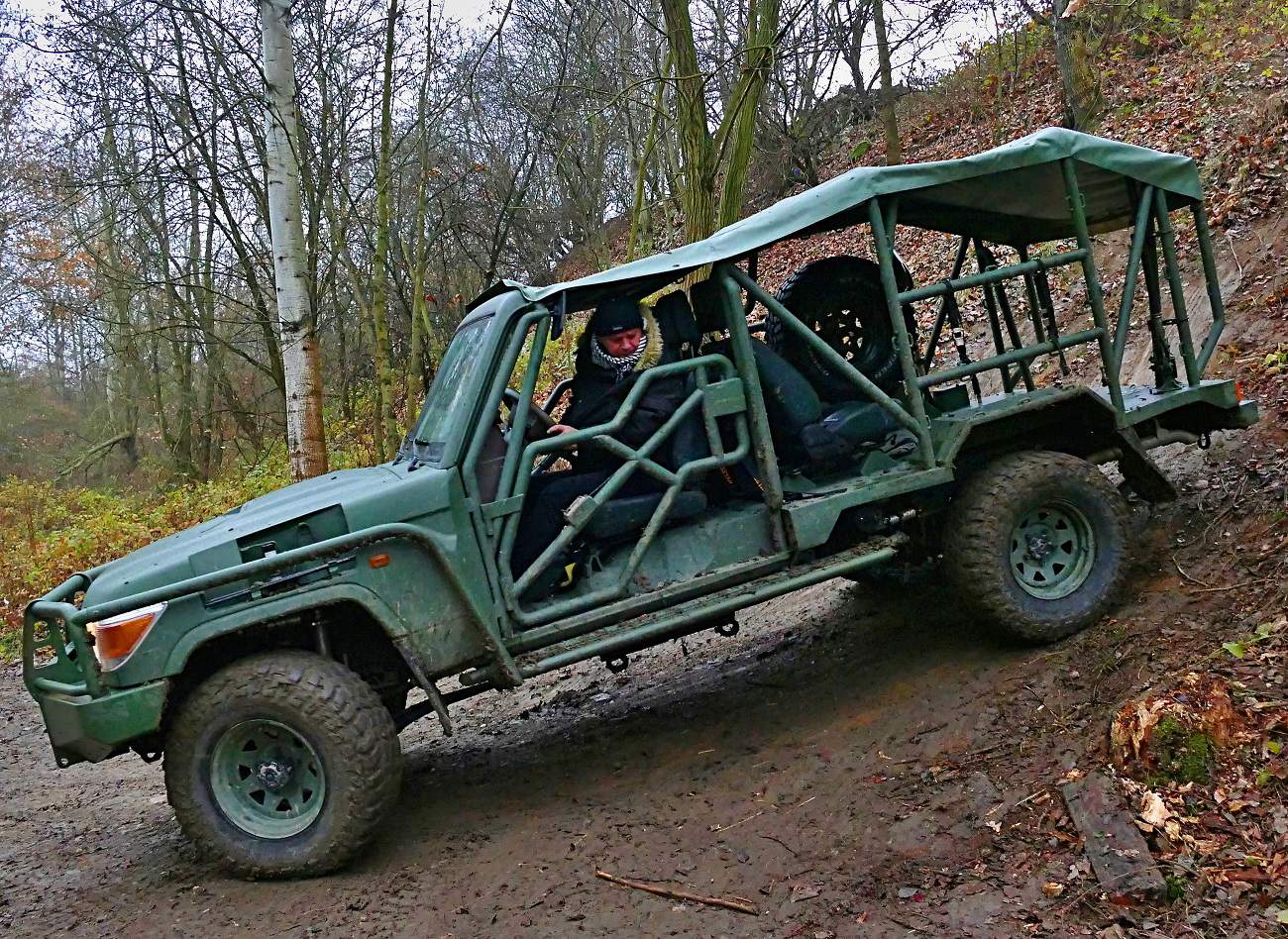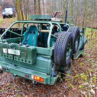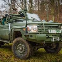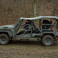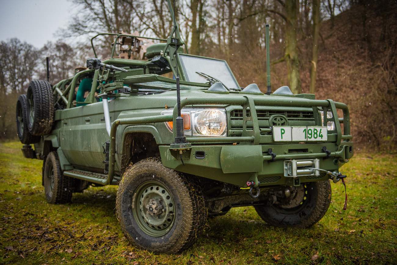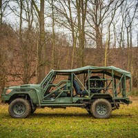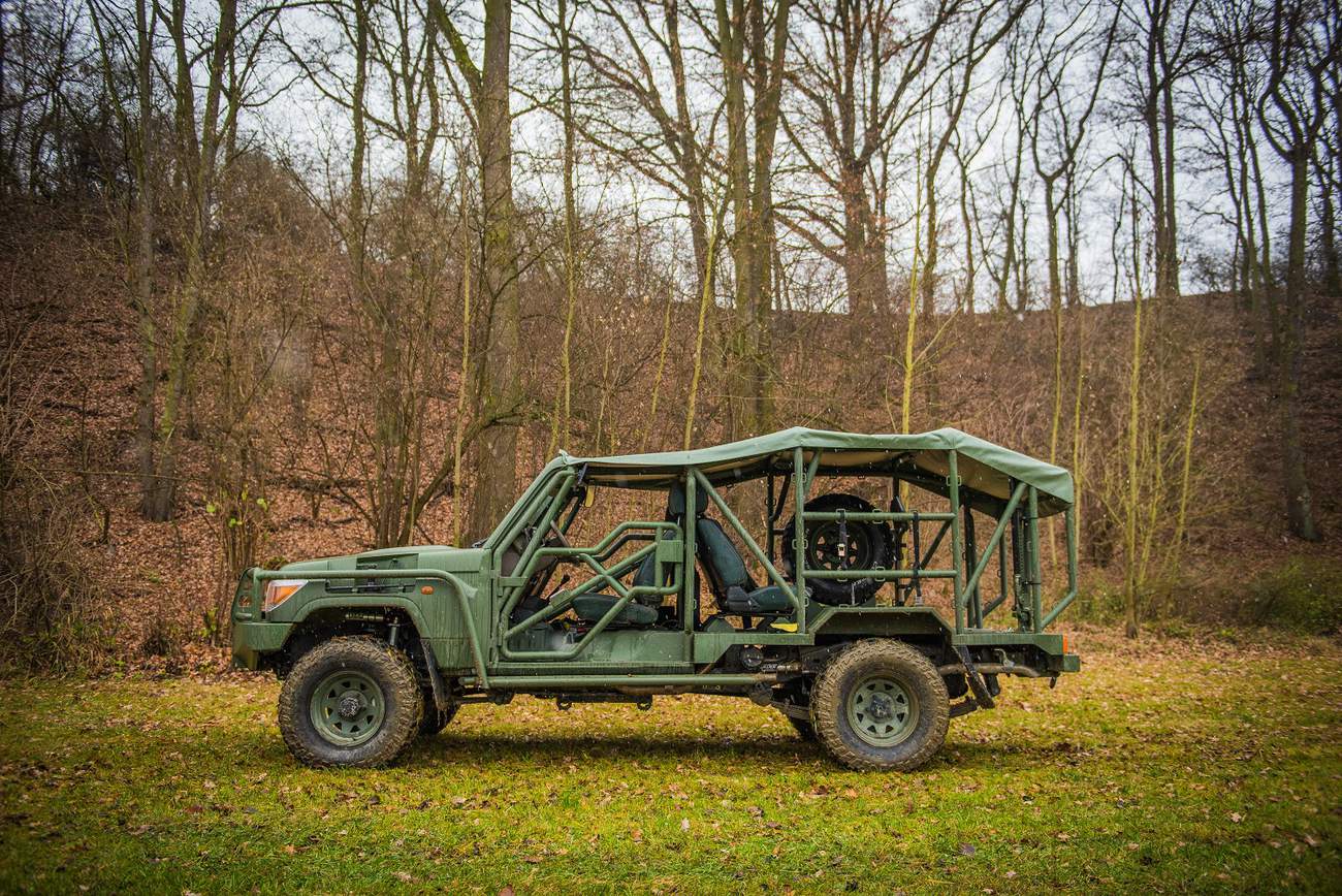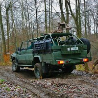 Někteří z návštěvníků se začínají pomalu vytrácet, doba pokročila a za chvilku se setmí. Zbývá mi ještě poslední jízda. Gepard číslo 2 neboli Rapid Deployment Vehicle, tedy vozidlo rychlého zásahu. Stejně jako LRPV je postaven na základu Land Cruiseru 70, ale slovo “rychlé” napovídá, že na rozdíl od svého většího bráchy půjde o variantu lehčí a obratnější. Je to vidět na první pohled – kabinu tvoří jen trubky, jde tedy o jakousi terénní superleggeru s maximální hmotností do 3,5 tuny. Prototyp v budoucnu čeká výběrové řízení, po němž by se mohl stát armádní náhradou za Land Rover Defender 110 Kovboj. V tuto chvíli se rozhoduji upozadit své řidičské touhy, protože mě zajímá, jak si bude počínat auto pilotované člověkem, jenž ho má tzv. v paži. Za volantem sedí Václav Buchbauer, vedoucí oddělení speciálních projektů. Důstojného pána, který k nám před chvílí na prezentaci promlouval klidným hlasem, teď jako by posedl zlý duch, osmiválec řve jako na lesy a bahno lítá metry vysoko. Tohle je lepší než horská dráha! Maximální rychlost vozidla je prý 168 km v hodině a já nemám důvod nevěřit, jakkoli mě ta představa upřímně děsí. Oba brody na výjezdu z areálu rozjařený řidič projíždí pod plným plynem, do kabiny se ze vzniklého vodotrysku kupodivu nedostala ani kapka.