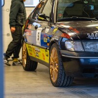 V: Držíme na dálku Jagymu palce, ten decat se jim líbit nebude. A dírky v prazích asi taky ne… Ano, chápete správně. Inspirovali jsme se u Porsche a stejně jako v případě 911 GT3, i my hodláme dojet po ose na závod, ten vyhrát a pak se zase po ose vrátit domů. STK je nutnost. Všichni máme nervy v kýblu a plánujeme více či méně šílené alternativy pro případ neúspěchu. Nakonec se napodruhé daří, ale s katem. Prý jsme přišli o 5 koní. “ Který debil skládal ty zadní brzdy, vypadá to, že levé kolo přibržďuje…” hlásí Jagy chvíli před odjezdem. Nemám k tomu co říct a s myšlenkou na hořící zadní brzdu někde na D1 u Humpolce se mi neusíná nejlíp.