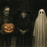 Okamžitě po posledním úderu se v tichu garáže zjevily tři postavy, jedna strašidelnější než druhá. První patřila hubenému, křivě stojícímu muži středního věku, jemuž zlo koukalo z krvavých očí. V rukou držel dýni, v níž měl vykrojené otvory, skrze které prosvítal hořící uhlík. Druhá byla starší a ženského pohlaví. Byla menší, ale zato tlustší, a tvář jí hyzdil dlouhý nos s bradavicí. Děsivě se smála a v ruce držela koště. Nejzáhadnější pak byla postava třetí, která snad ani neměla pevný tvar – tvořily ji jen obrysy podobné mlze za zdmi garáže.