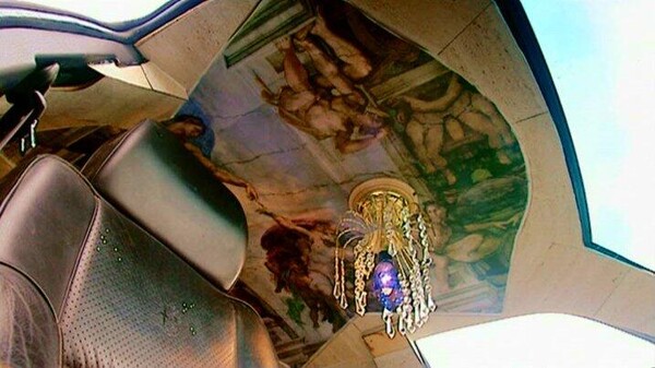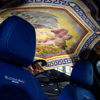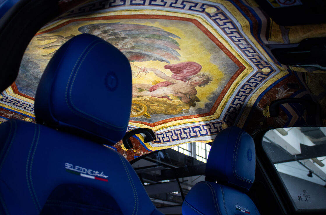 Modrá se objevuje i v interiéru na alcantrových sedadlech a dveřních výpních, stejně jako na speciální čalouněné palubní desce. A zlatým hřebem je pak zdobení stropu, kde je vyvedena kopie renesanční fresky Zuccariho Apolla, která se, jinak nachází v papežské síni hradu Odescalchi v Braccianu.