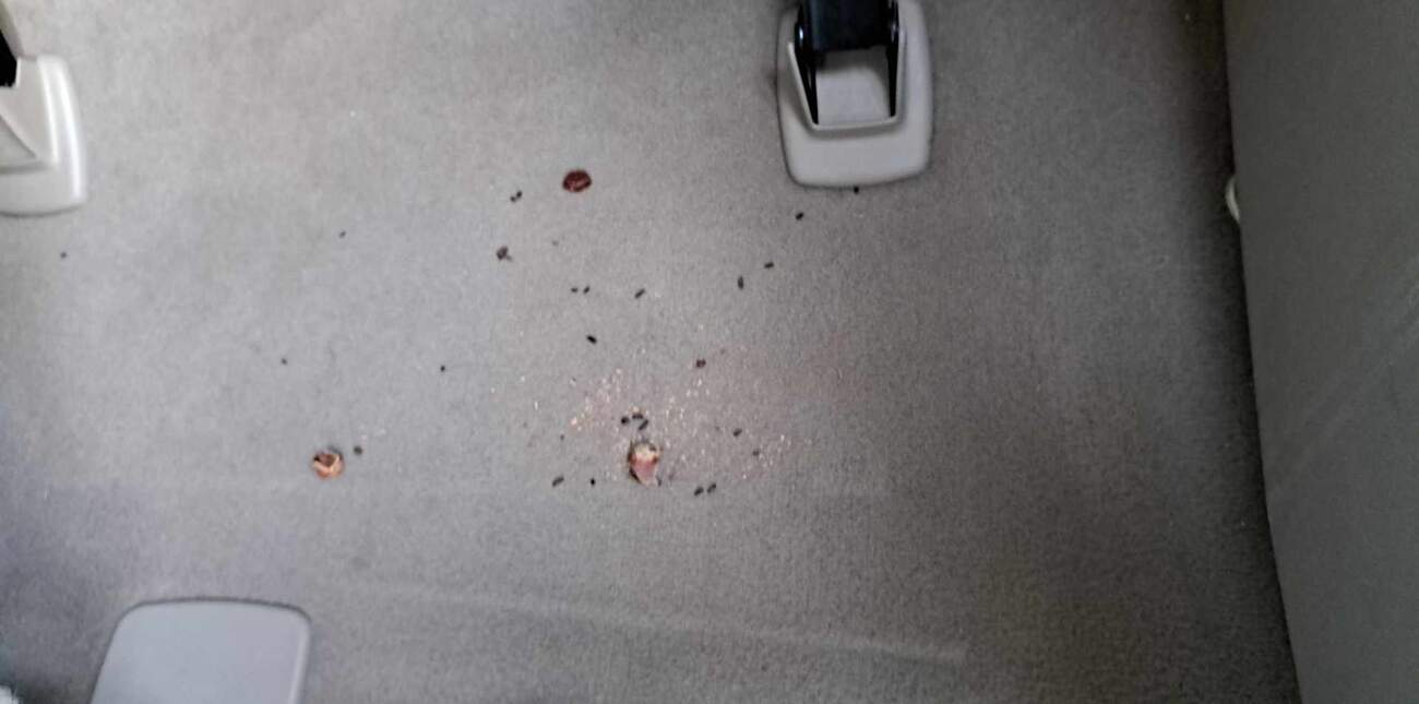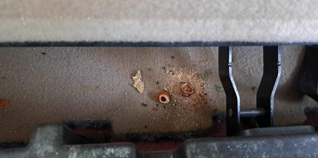 Vyžraly kus molitanu ze sedadla, naštěstí v místě, kde to moc nevadí, sežraly papíry v přihrádce u spolujezdce a hlavně udělaly hrozný bordel. Rozkousané oříšky a další zásoby jídla jsem našel ve všech třech řadách pod sedačkami. Samozřejmě vždycky doplněné o soustavu hovínek a typický zápach.