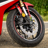 Agresivní, sytě rudá kapota se skromným plexi, akorát na zalehnutí a několik dalších detailů, naznačují už z dálky, že tady půjde striktně o (okruhový) byznys. Nenápadné nozdry pod světly jsou funkční coby náporové sání a krmí motor čerstvým vzduchem. Určitě by se tady daly vypíchnout takový ty promo hlášky, že i na místě to vypadá jako by to letělo stopade apod. Mě se to asi i líbí. Jediné, co se kazí dojem, jsou samozřejmě homologační prvky, které umožnují pohyb po silnici. To už ale ani nepřekvapí, mezi motorkami je to poměrně standard. Uchytit registrační značku tak aby vyhovovala předpisům a zároveň to nebyla pěst na oko se mnohdy zdá snad i nemožné. Zblízka jsem to nezkoumal, ale snad to drží třeba jen dva šrouby a dá se ho toho snadno zbavit, kéž by byl ten držák pouze nacvakávací. No nic, je čas vyrazit k domovu.