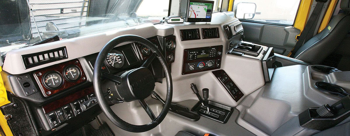 Co vám tedy Hummer nabízí? I na poměry devadesátých let je výbava velmi skromná. V té základní je motor, automatická převodovka, volant a nějaká ta kola. Z volitelné výbavy jsou potom k dispozici dveře, střecha a několik komfortních prvků. Výbava však v tomto případě nehraje roli. To podstatné se ukrývá pod kapotou. Resp. pod kapotou se neukrývá nic, ale víte jak to myslím – důležitá je v tomto případě technika. Motor (k dispozici bylo v průběhu výroby několik vznětových a jeden zážehový osmiválec) je umístěn uprostřed vozu, jen pár centimetrů od řidičova pravého kolene. Z hlediska řidičova kolene to není ideální umístění, z hlediska těžiště a odolnosti vozidla ale ano. A to tu hraje prim. Výkon motoru se přenáší přes automatickou převodovku na všechna čtyři kola. Ta jsou obřích rozměrů a umístěna jsou v rozích bytelného rámu. Na boky motoru byly poté přišroubovány sedačky pro posádku a celý stroj se překryl lehkou hliníkovou karoserií – a Humvee byl na světě.