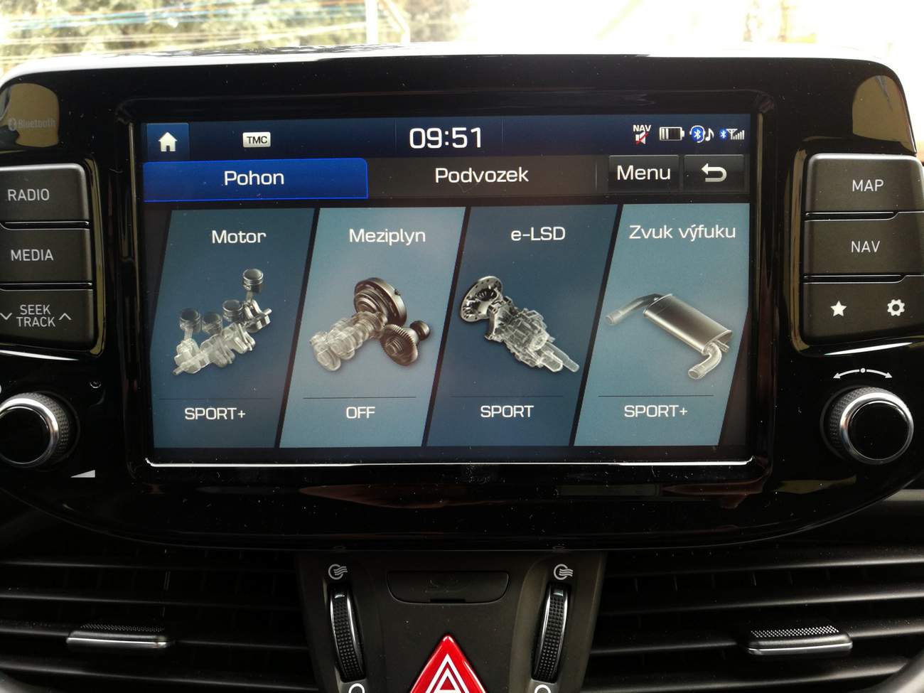 V Hyundai opět přichází na scénu tlačítko s vlaječkou. Jeho druhým stiskem totiž navolíte mód ‘custom’, kde můžete svým požadavkům přizpůsobit 7 oblastí. Když na zahraničních webech vycházely na podzim první recenze i30 N, četl jsem často lkaní na přehnanou ostrost módu N. Vůbec ale tyto breky nechápu, protože stejně budete jezdit na mód N custom, kde si auto nastavíte přesně jak chcete. Pokud to vezmeme přes pizzu, nevyhovuje-li vám nabídka, tady máte možnost namixovat si ji ze surovin dle vlastního výběru. Nerad bych mluvil za všechny, ale já byl zcela spokojen a poskládal si hot hatch podle svých představ.