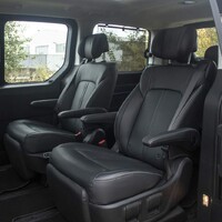 Konečně tedy všichni sedí nebo leží, popíjejí vodu a kafe, nabíjejí si mobily a poslouchají hudební produkci příjemného soundsystému Bose. Můžeme vyrazit. Už po usednutí za volant si připadáte spíš jako ve velkém SUV než v dodávce a stejný pocit zůstane i po rozjezdu. Staria sice vypadá jako malý autobus, platformu ale sdílí s modelem Santa Fe a vzadu má – alespoň v této verzi – víceprvkovou nápravu. Na prvním retardéru je jasné, že podvozek se co do komfortu mimořádně povedl. Ani na osmnáctkách nedrncá a mění dílo středočeských silničářů téměř v dílo silničářů německých. Na větších nerovnostech se pouze trochu víc zhoupne, ale rozhodně neruší slastně poklimbávající pasažáry ranami do ledvin. Zároveň je v kabině téměř hrobové ticho, což tvoří zvláštní kontrast k obřím oknům – součástí okolí zároveň jste i nejste. V zatáčkách je samozřejmě cítit hmotnost, která se se čtyřkolkou blíží k hranici dvou a půl tuny. Navzdory plavnému podvozku však auto při zatáčení hezky drží stopu, nevlaje mezi pangejty a nenaklání se, jako by se chtělo odkutálet do polí.