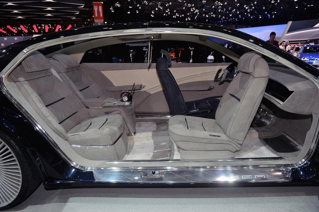 Interiér, do kterého nastoupíte z červeného koberce, který představuje červené světlo, které Gea promítne na zem, velkými "suicide doors" se zdá velmi útulný. Nejvíce se myslelo na pasažéry vzadu, přecejen, kdo by se cpal dopředu, když se může vézt vzadu? Veškerá vnitřní výbava je ovládána ze zadní sedačky a interiér má 3 módy. Prvním je Business, při kterém je vnitřek jasně osvícen a můžete pracovat na dvou devatenácti palcových obrazovek. Wellness mód umožňuje cvičení za jízdy, ať už to má být cokoliv, a Dream mód ztlumí světla, zatmaví skla a z pravých sedaček vytvoří postel. Kdybyste ale přecejen chtěli sedět vepředu a stát se řidičem, můžete! Sedačka řidiče byla zachována a auto se řídí pilotuje pomocí volantu beranů.