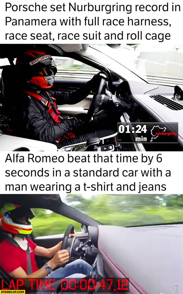 29. 11. 2017, 19:51Alfa se nemusí bát...stále drží rekord pro zajetí nejrychlejšího kola se sériovým čtyřdveřovým autem na Ringu zatímco jezdec měl na sobě džíny a triko s krátkým rukávem...a gopro přidělaný izolepou :D