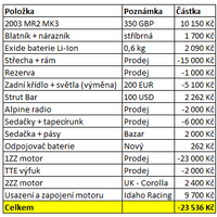 Dohodli jsme se s Láďou, že jí koupíme napůl a časem se dohodneme, jestli budeme kupovat druhou, nebo ne. Z auta jsme o víkendu vyndali střechu, kompletně interiér, hlavový oblouk (je to tenkostěnná legrace, která k ničemu jinému, než „na oko“ není), windshot a spoustu dalších zbytečností, které jsme prodali. A tady to začalo být zajímavé. Díly celkem se prodaly za 24.100,-, motor s převodovkou a TTE výfukem za dalších 25.000,-. 2ZZ motor, který dává 190 koní a točí špičkově 8.100 otáček nás stál 2.400,- (za 600 GBP jsme koupili Corollu a za 15.000,- ji bez motoru prodali). Za 2.000,- jsme koupili na inzerát čtyřbodové pásy a hnusnou trubkovou sedačku. V jednoduchém součtu jsme na záporné pořizovací částce a sice – (mínus) 25.236,- včetně usazení a zapojení 2ZZ. Pro ty, které zajímá detail, je dole připravená tabulka.