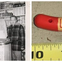 Vlevo na fotografii George Molchan v porovnání s “normálně velkými” lidmi. Vpravo párková píšťalka, dnes celkem ceněná relikvie.