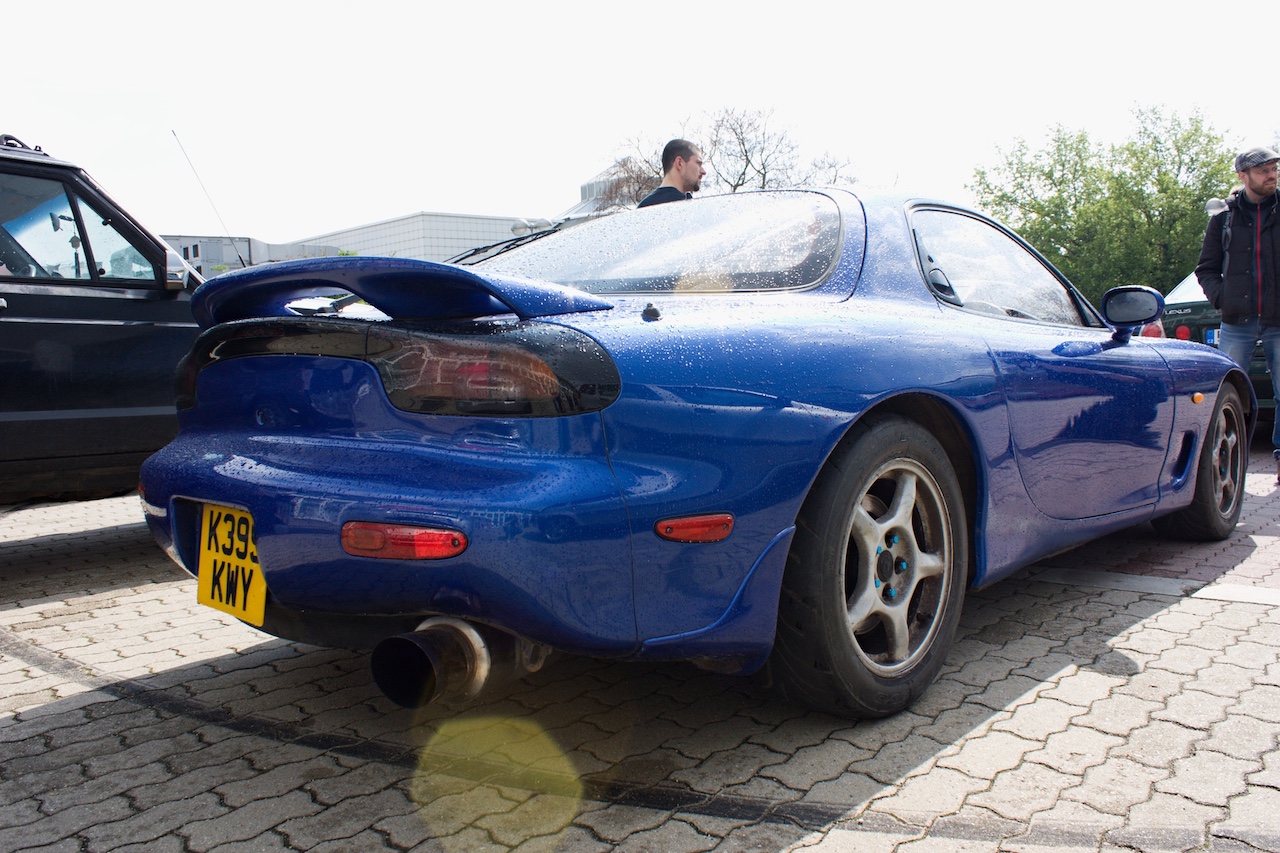 Podívaná to nakonec byla opravdu pěkná, a přátelským rozhovorům nijak nebránily ani pravidelné vydatné přeháňky, které jsem přečkával coby cukrový panáček uschován v příjemném teple kabiny maličké Toyoty. Leckoho překvapil místní notoricky známý Trinom, který přivezl svého nového angličana, tedy vlastně japonku, krásnou modrou RX-7 FD3S. Do její kabiny nevěřícně usedali další a další amerikanisté až se nakonec vytvořila taková maličká fronta.