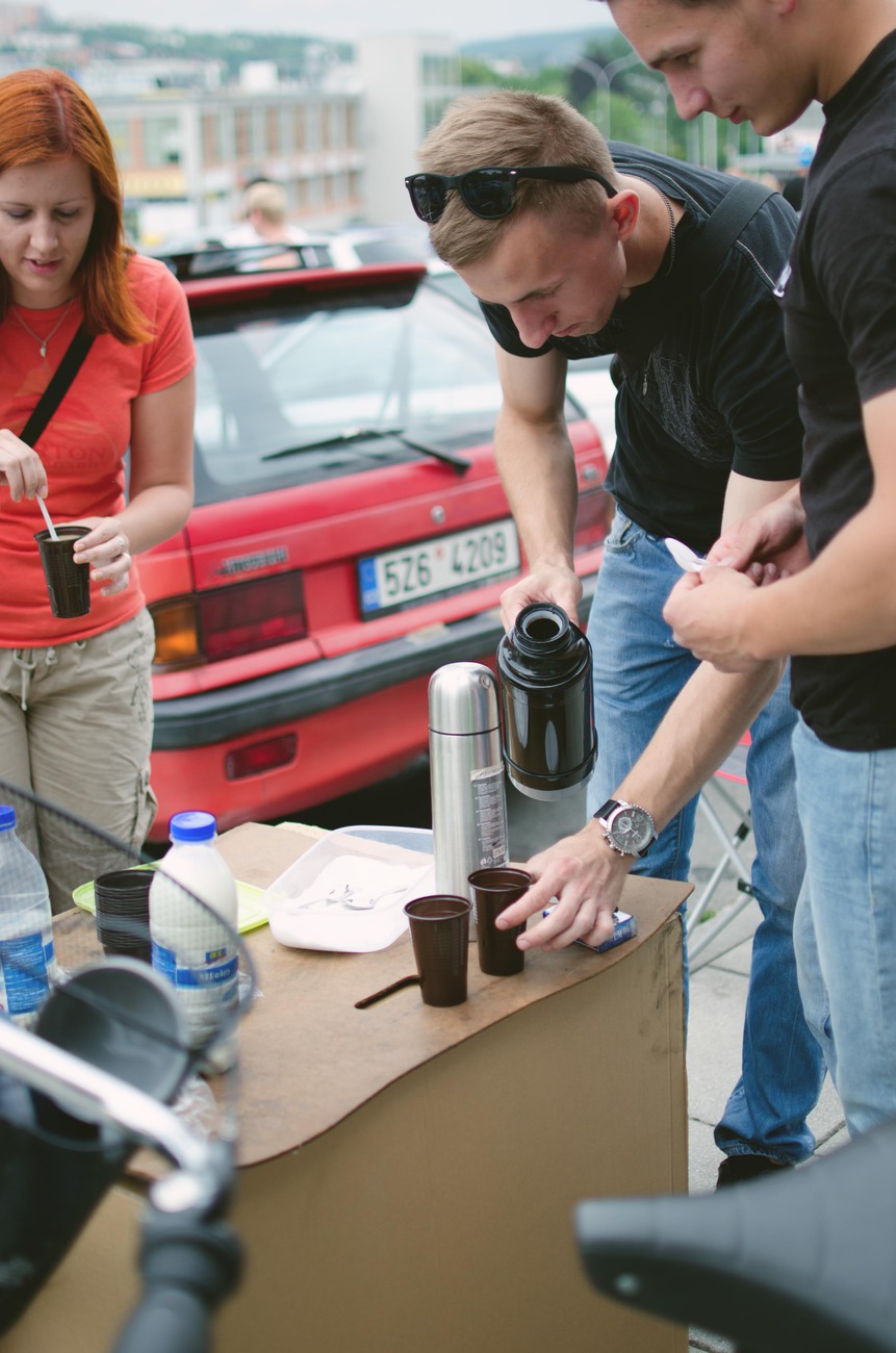 Stačila nakonec kapacita prastarého zlínského parkoviště před ještě starším Velkým kinem? Ano, stačila. Možná stačila díky faktu, který byl nad míru potěšující – Okukujících zvědavců bylo více než stojících, plechových klenotů. Bohužel, ze stejného důvodu (Protože auta nepijí kávu) jsme se ocitli po hodině setkání na suchu s kávou a je jasné, že do příště budeme nuceni připravit mnohem větší porci kofeinového lektvaru.