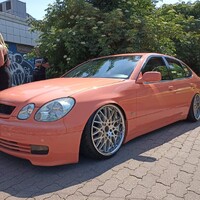 Hned vedle se nachází další japonská ikona luxusu, totiž Lexus GS v takové zvláštní oranžovo-růžové barvě, která se mi vlastně až tak nelíbí, ale přesto je podmanivá takovým zvláštním způsobem. Pod velkými koly ji doplňují zebrované brzdiče. To mě pobavilo. „Lososová“ slyším někde z davu. Aha, tak proto, takže teď mám ještě hlad, fakt dík.
