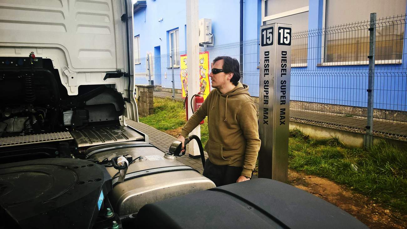 Pak přišel na řadu kozlík. Bílý tahač s hliníkovými disky, největší dvoulůžkovou kabinou s ledničkou a pěti sty koňmi. Nečekal jsem velký rozdíl, ale díky jinému zpřevodování, nižší hmotnosti a kabině uložené na vzduchu oproti pérům u osmikolky je svezení ještě pohodlnější. A dokonce mi bylo dovoleno vypnout protiprokluz. Je to kravina. Furt to hrabe a člověk se nikam nedostane. Tohle auto prostě potřebuje návěs a dlouhou štreku, kterou se vám bude snažit všemožně zpříjemnit. Třeba i tím, že nemusíte šlapat na spojku. Na řadičce je knoflík, který to udělá za vás i se šarmantním meziplynem. Malebné!