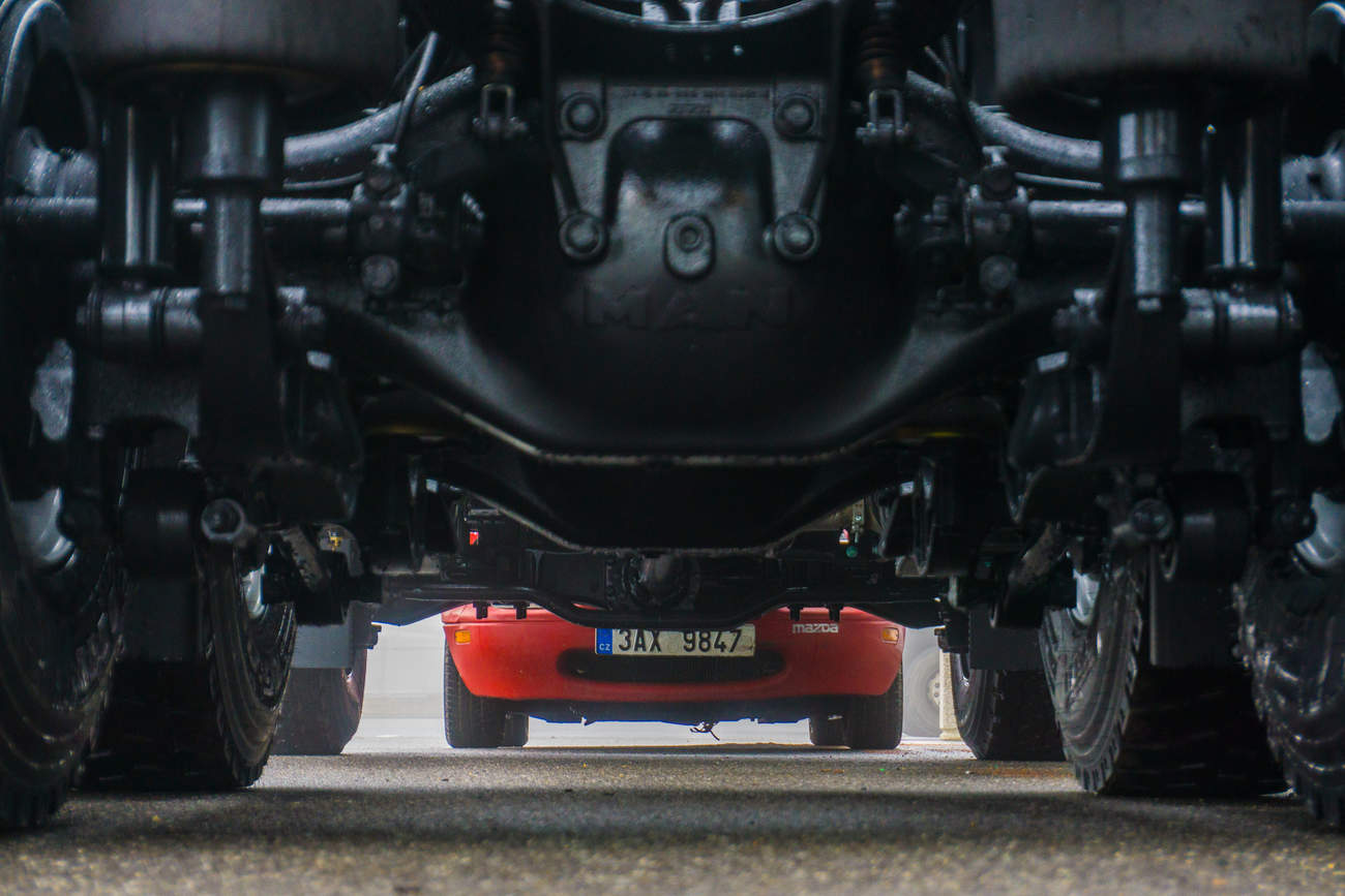 Důkladná prohlídka nového náklaďáku je ovšem rájem i pro techniky. Zvláště pokud je kamion čistý. Jestli se chcete něco naučit o tom, jak funguje automobil, vlezte si pod kamion. Dokonce i když máte 27 dioptrií, všechno je tak obrovské a jasné, že i návštěvou technického muzea se těžko vzděláte víc.
