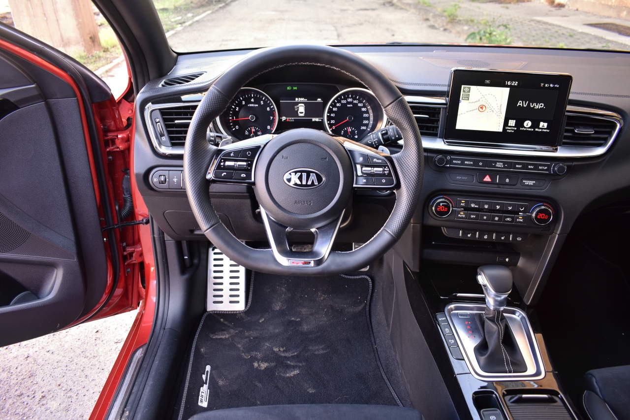 Ehm, pardon, něco o interiéru jsem napsat musel, když už mi to půjčili jsme se rozhodli vůz otestovat. Pravý klenot je však zraku skrytý. Jen co se rozjedete (a zastavíte, protože telefon jde spárovat jen v klidu), všimnete si tužšího naladění podvozku. Kia obyčejně sází spíše na komfort, než na německy neústupné podvozky, ale ProCeed je přeci jen o něco tužší a bezprostřednější než jeho sourozenci. Tedy nechápejte mě špatně, výtluky, rolety, pasti na mamuty a další zpestření českých vozovek zvládají tlumiče skvěle a co balancuje na samém ostří hrotu uvěřitelnosti: Rány se nepřenášejí do kabiny. O nerovnostech víte, protože se jako řidič soustředíte na jízdu a ne proto, že si objednáváte příští návštěvu zubaře a chiropraktika. Dokonce i na zadních sedadlech je akustický komfort na velmi příjemné úrovní, což konkurenci stále ještě moc nejde. Tužší podvozek se pak naplno projeví, když sešlápnete plyn. Jistota, se kterou lze vůz řídit s přesností na desetiny milimetru, mi naprosto vyrazila dech. Takhle čitelně jsem se naposledy svezl snad jedině v šestkové Mazdě. Do známých zatáček okolí obce Seč jsem si troufal se stále větším odhodláním, aniž bych se bál, že nadšení zastíní mé schopnosti. No dobře, schopnosti skvělého podvozku. Dokonce i brzdy se skvěle dávkují a ani po půl hodině tempa ‚co to dá‘ neházely flintu do žita. Spíše brzdily s nasazením komorníka, který vám nese sedmou žitnou pronášejíc lakonické „jak si pán přeje“.