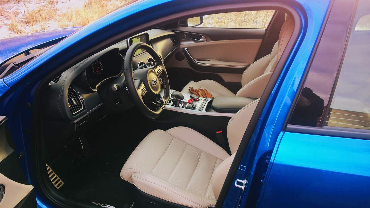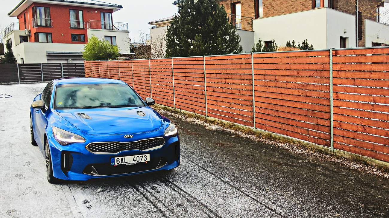 Tak za prvé – vůz je zcela očividně modrý. Zatím však není důvod k jakémukoli zklamání, barva Stingeru vyloženě sluší. Jsou tu však další detaily, které můj snový výlet usazují do reality. Pod kapotou nemám benzínový šestiválec, o pohon stroje se stará naftový agregát. Jeho výkon se přenáší na všechna čtyři kola, ani zadokolka se tedy nekoná. A k tomu všemu oči čas od času zavadí o logo Kia. Já vím, Kia už dávno není tím výrobcem Shumy, jako před lety, přesto však dosud nic podobně sebevědomého logo Kia neneslo.