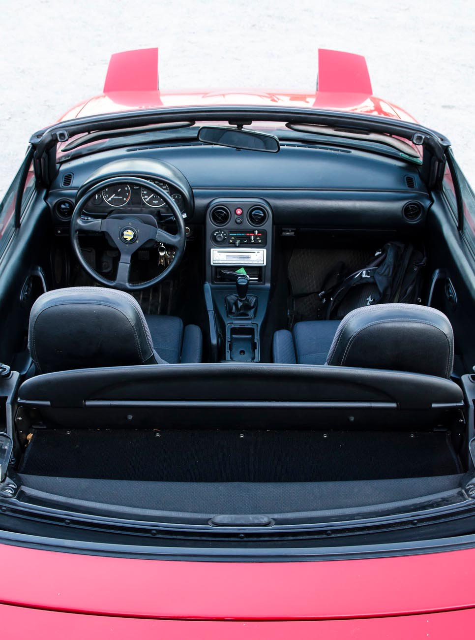 Co jsem si to vlastně koupil? Je to MX-5 z roku 1992. Pod kapotou se jí ukrývá jednašestka, která prý kdysi měla 115 koní. Je červená. Má spoustu kosmetických vad. No dobře, to bych přeháněl. Její karoserie je v relativně pěkném stavu, ale za ta léta se nevyhnula několika odřeninám, promáčklinám a dalším zraněním. Nechybí troška koroze, bez které by to ani nebyla Miata. Oba prahy mají na jednom konci puchýřky/menší díru. Naštěstí nebude složité je zapravit. Jinak karoserie vypadá dobře a stav nosníků naznačuje, že možná ani nebyla zásadně bouraná. A ta kola… Jsou to má oblíbená kola, která na NA prostě patří. Střecha už není původní, tvrdý a nepoddajný vinyl nahradil jemný a měkoučký mohér. To je velké plus. Z elektrické výbavy (rozuměj světla, okénka a anténa) funguje kromě antény vše. Když se posadíte dovnitř, uvítá vás vážně pěkný původní interiér, ve kterém jen trochu svítí rádio. Dokonce i volant Momo je původní, i když jeho středový kryt se aktuálně povaluje v kufru. Je to tak hezčí.