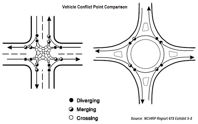 Právě onen výběr, do čeho nabouráte je hlavní devízou kruháků. Každá křižovatka má tři typy míjení (viz obrázek). V principu buď protínáte dráhu jiného vozu, připojujete se k jeho směru jízdy, anebo se z něj odpojujete. Nejnebezpečnější z logiky věci jsou ony křižné body, jelikož vás nutí sledovat dění mimo vaši zamýšlenou dráhu. Nejobyčejnější křižovatka má 16 křižných bodů, 8 připojovacích a 8 odpojovacích. Oproti tomu alternativa v podobě klasického ‚rondelu‘ má připojovací body čtyři, odpojovací také čtyři a křižným bodem pro jistotu nedisponuje vůbec. Zkrátka sledujete svůj pruh, zda se do něj můžete připojit a zda ho můžete opustit. Návštěva z boku tak (až na podnikavce s terénními ambicemi) nehrozí.