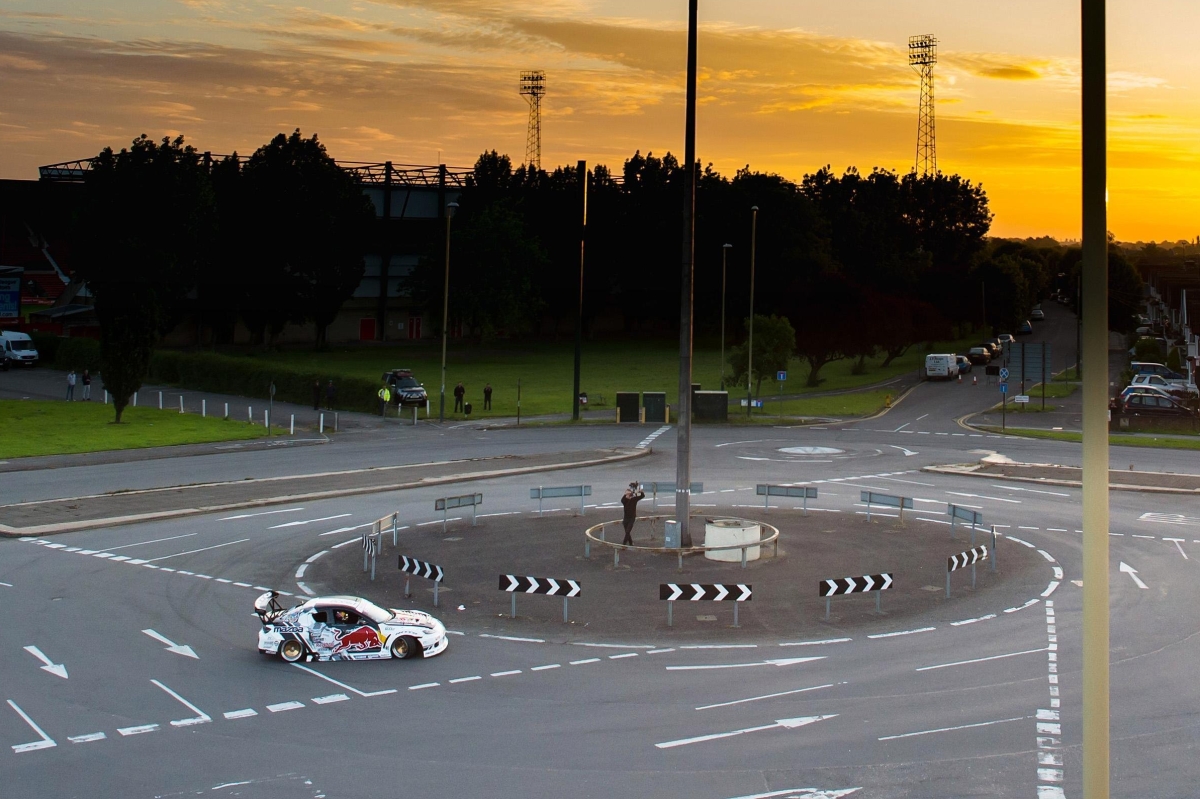 4. Chyťte smyk pěkně otočením volantu zpět do prava a modulujte jemně plyn , tak aby se zadek auta stále přetáčel, ale smyk zůstal v rovnováze ( to je nejtěžší část průjezdu kruháčem)