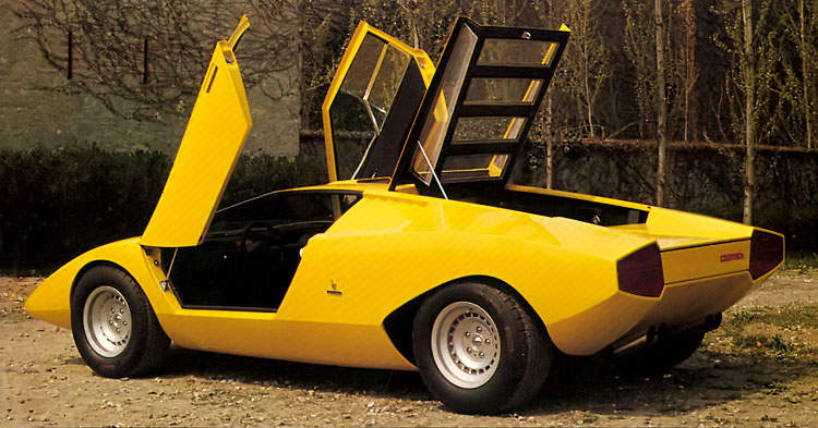Studie Countach se poprvé představila na ženevském autosalonu v roce 1971. Celým jménem se ona přízračná placka jmenovala Lamborghini Countach LP500. Zkratka LP pochází z italského ‘longitudinale posteriore’, což značí, že vůz má motor uložený podélně vzadu, číslovka 500 potom označuje pět litrů zdvihového objemu motoru. Ano, byl to pouze prototyp pro autosalon, ale byl plně funkční. Měl pětilitrový vidlicový dvanáctiválec o výkonu úctyhodných 440 koní a vůz s ním dosahoval maximální rychlosti přes 300 km/h. Cíl byl ještě výš, touhou konstruktérů bylo pokořit 320 km/h, tedy 200 mph. Design dostalo na starost studio Bertone, ve kterém se návrhu ujal Marcello Gandini. Jeho role v historii značky Lamborghini je velká a nezastupitelná, ale o tom ještě bude řeč. Ostře řezaná karoserie Countach ještě zdůrazňovala proporce automobilu, show ještě umocnily vzhůru výklopné nůžkové dveře.