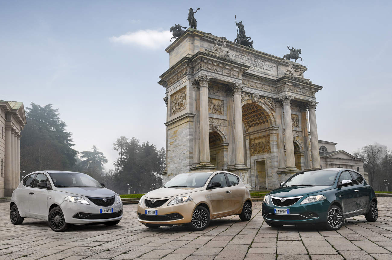 Faceliftované Ypsilony pózují za Porta Sempione v Miláně, podzim 2015 nebo později. Tehdy už byla značka Lancia fakticky odepsaná.