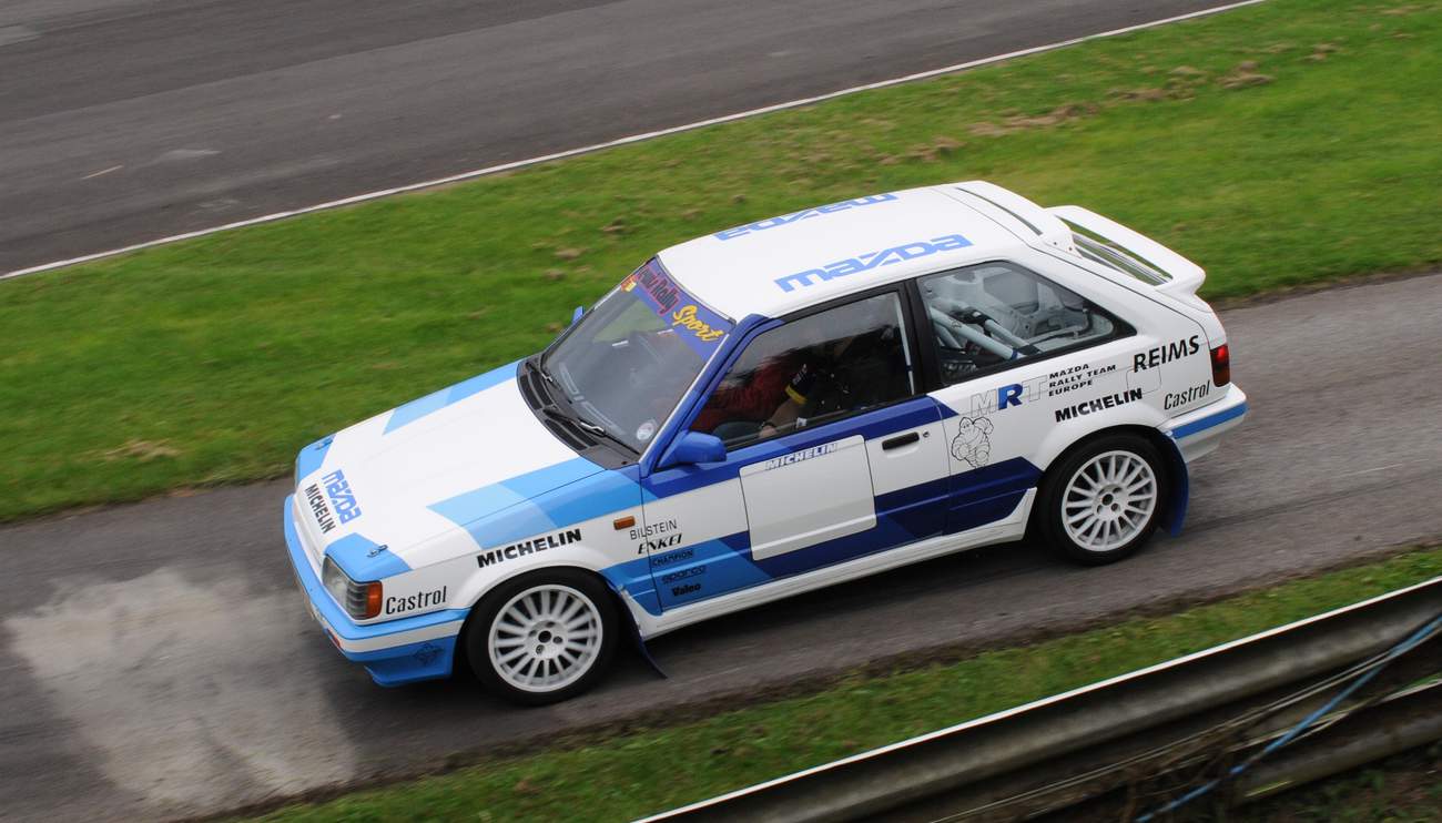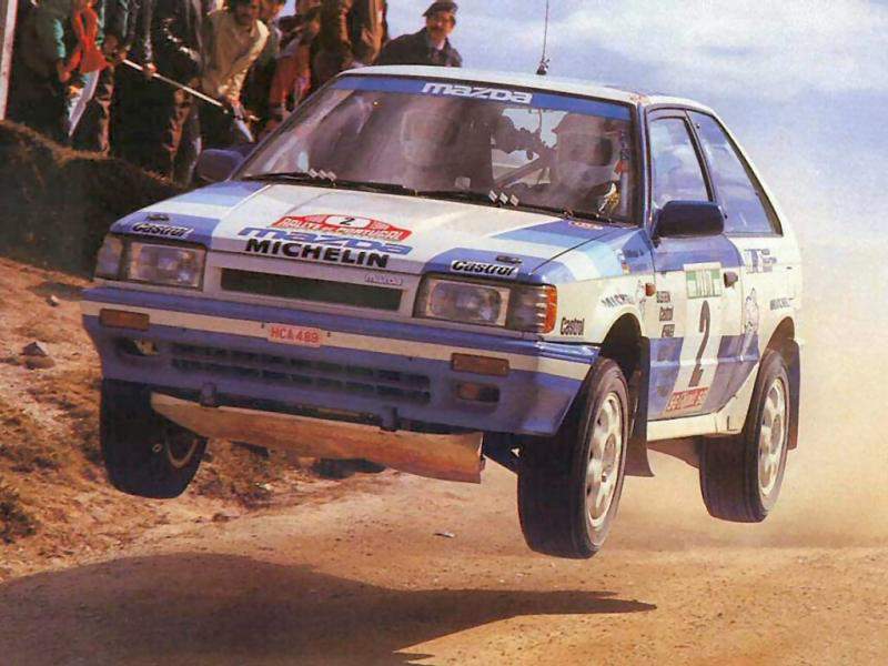 Nebyla to jen Lancia, která zvládla rapidní přechod na nová pravidla se ctí. Zatímco italský závodní tým podpírala oddaná automobilka, jejich vozy řídili nejlepší světoví řidiči s dekády zkušeností, Mazdě pomohla obyčejná náhoda. Závodní tým s tovární podporou japonského výrobce začal jako soukromý a až po úspěchu s Mazdou RX-7 skupiny B, která v roce 1985 získala třetí místo v Rally Akropolis, dostal plnou tovární podporu. V roce 1986 byla nasazena na Rally Monte Carlo Mazda 323 AWD v homologaci pro skupinu B ale příliš těžký a nevýkonný vůz na špičky své doby nestačil. Narozdíl od vítězných speciálů pořád vycházel ze sériového vozu, což byl v roce 1986 nepřekonatelný handicap. Jak příjemné bylo překvapení, když s několika málo úpravami vznikl mrštný speciál skupiny A pro následující rok. Jeho srdcem byla přeplňovaná šestnáctistovka s litinovým blokem a hliníkovou hlavou s rozvodem DOHC.